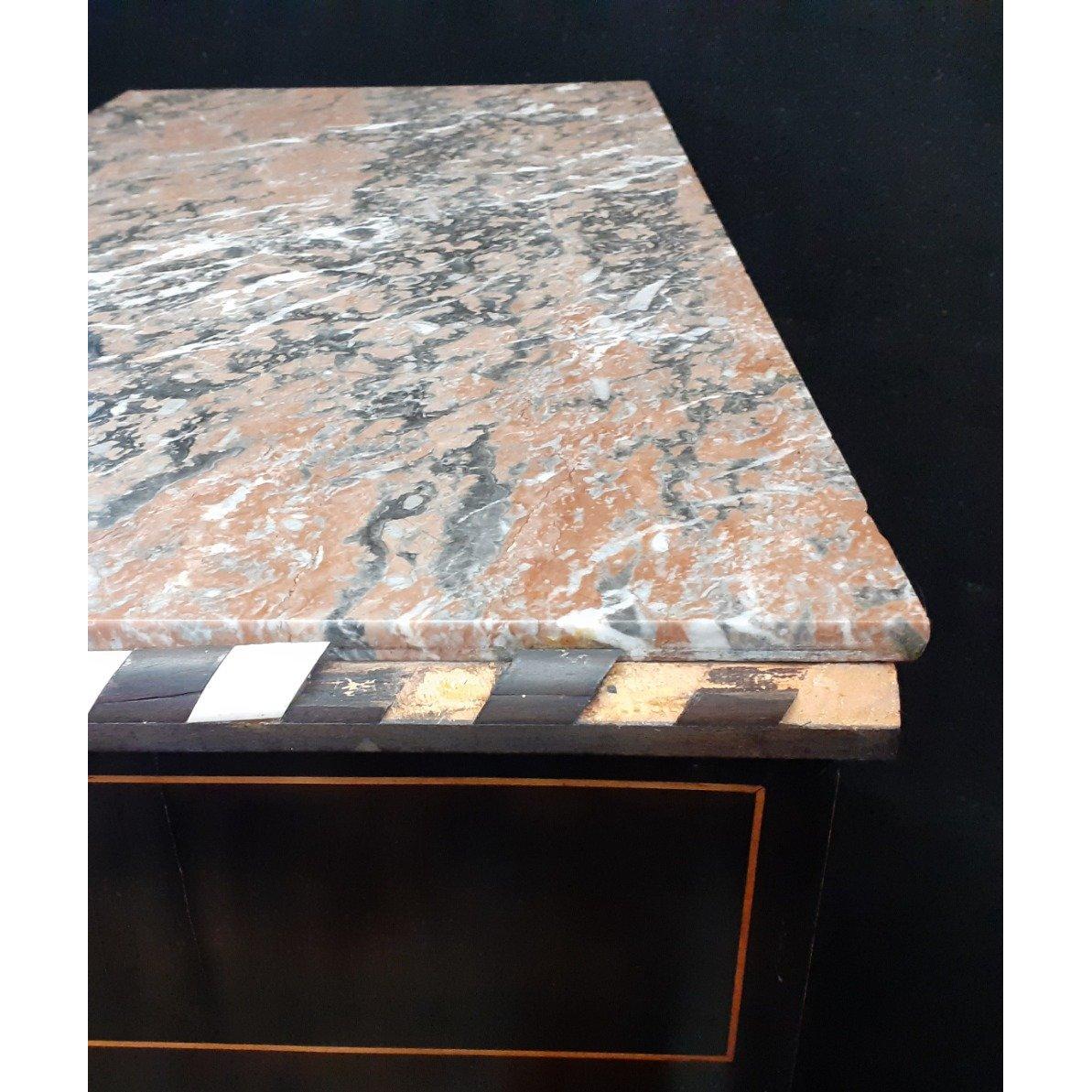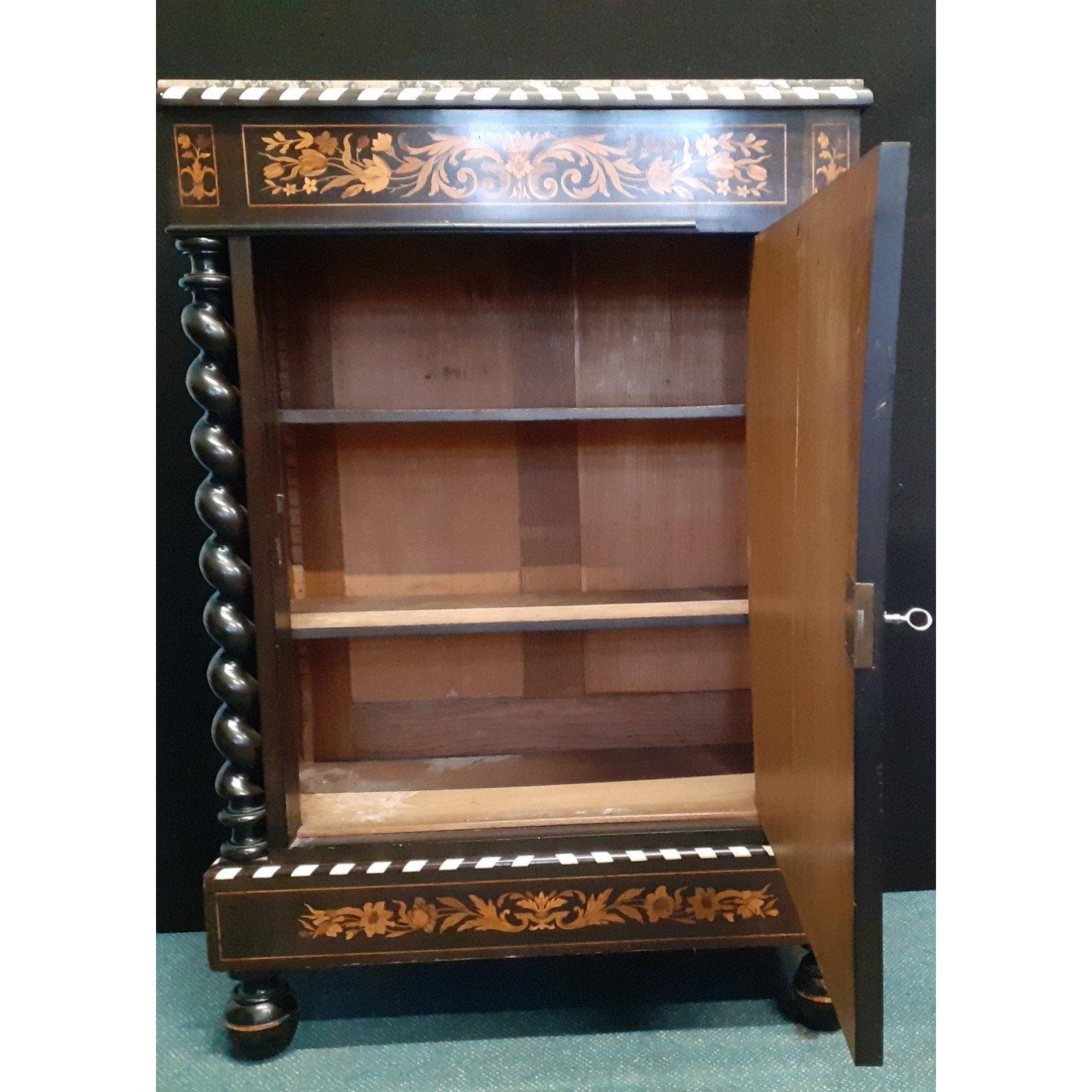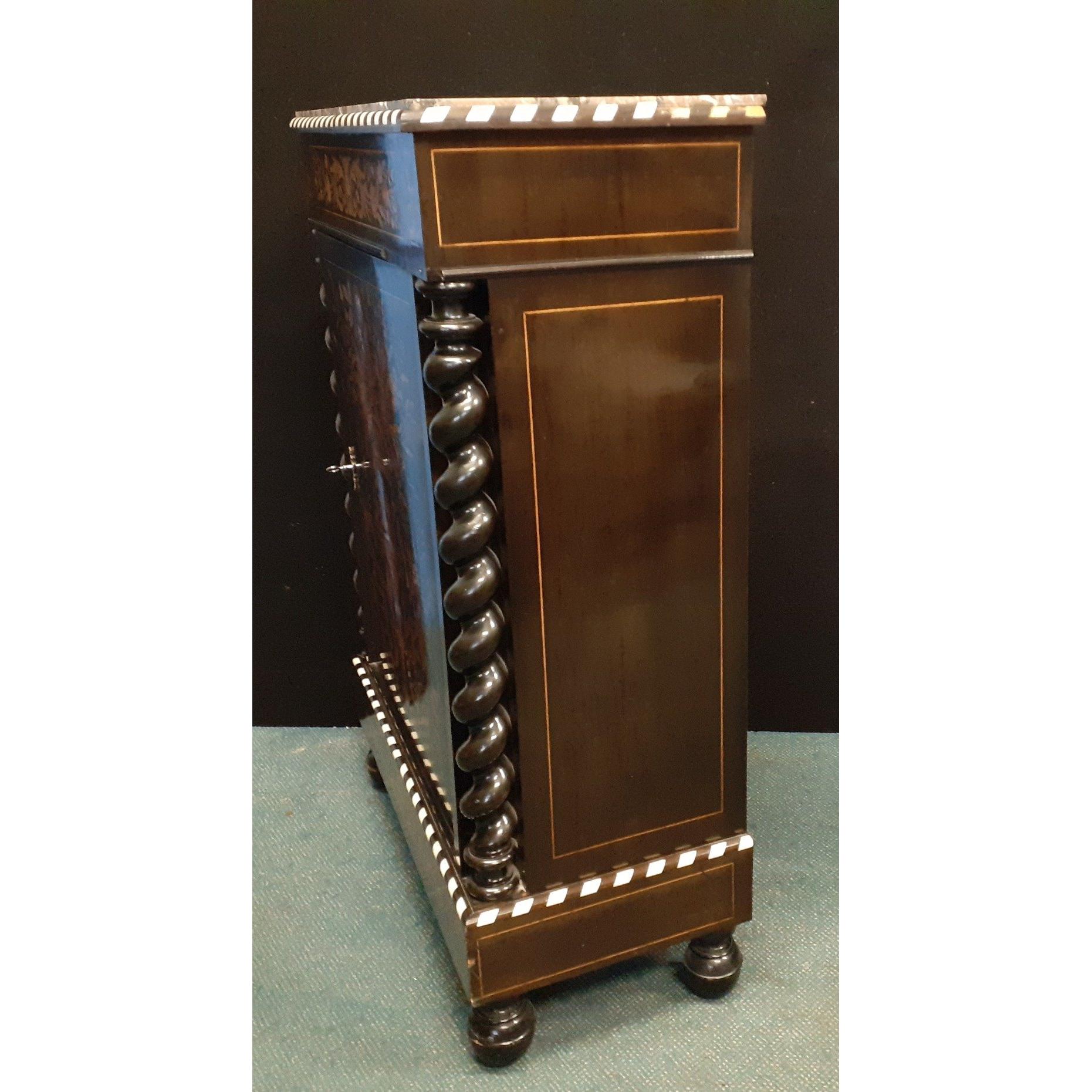 An exquisite lacquered cabinet with inlaid marquetry and marble top which may be a later addition. A hand-written maker's mark is written under the marble. Barley twist pillars adorn the sides finished with bun feet. A gorgeous inlaid detail of wood and bone beading surrounds the top edges (some pieces detached some of which are stored within the cabinet). Comes supplied with the key. H115cm x W80cm x D40cm approx. A stunning piece possibly of French origin