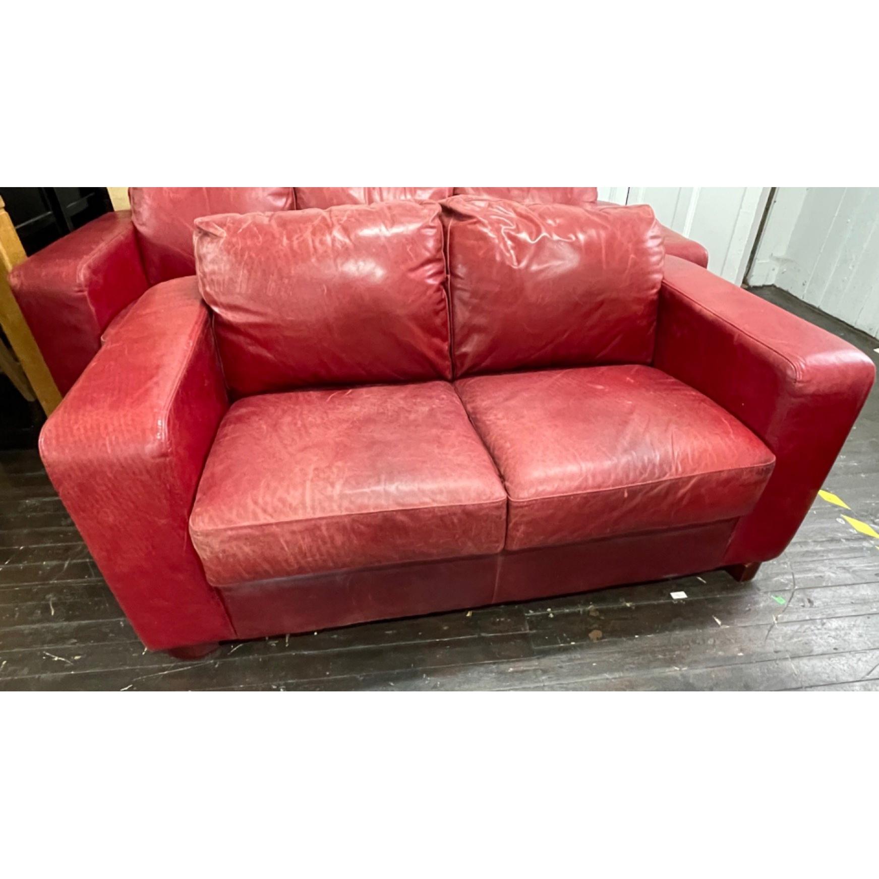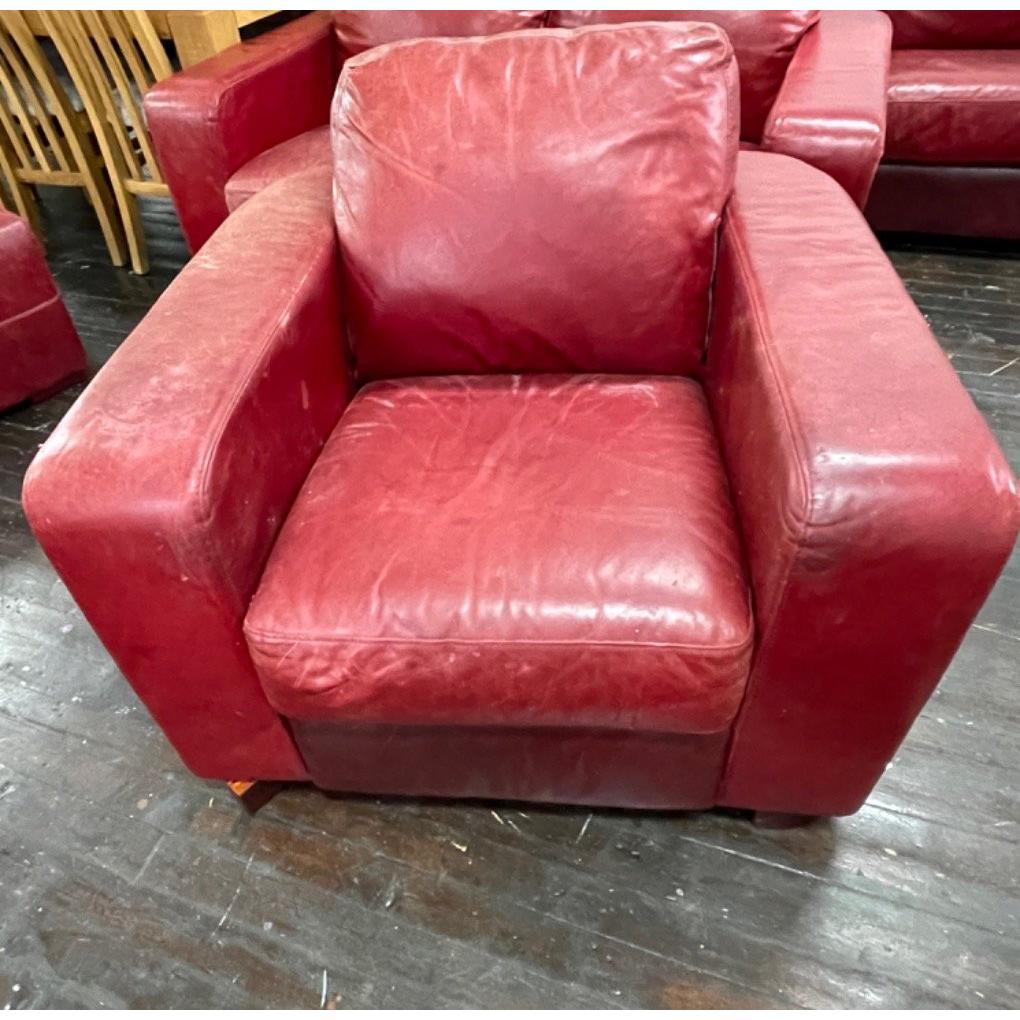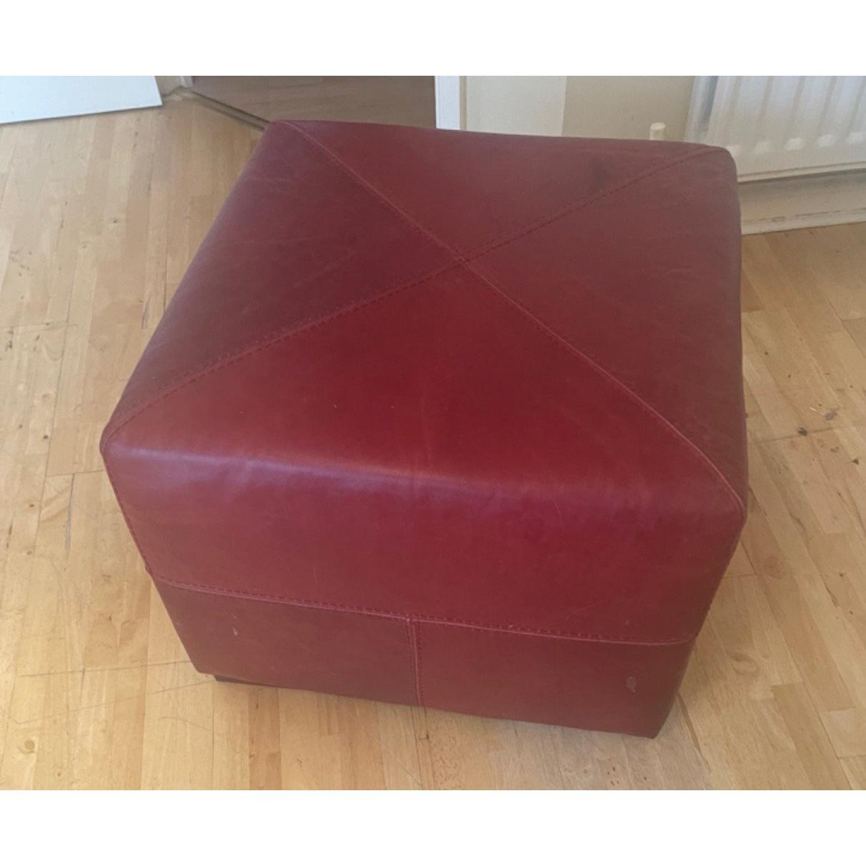 A stylish RED LEATHER/HIDE 4 piece suite to include a 3 seater couch, a 2 seater couch and a really stylish matching armchair and separate matching footstool - this suite has a nice 'lived-in' patina