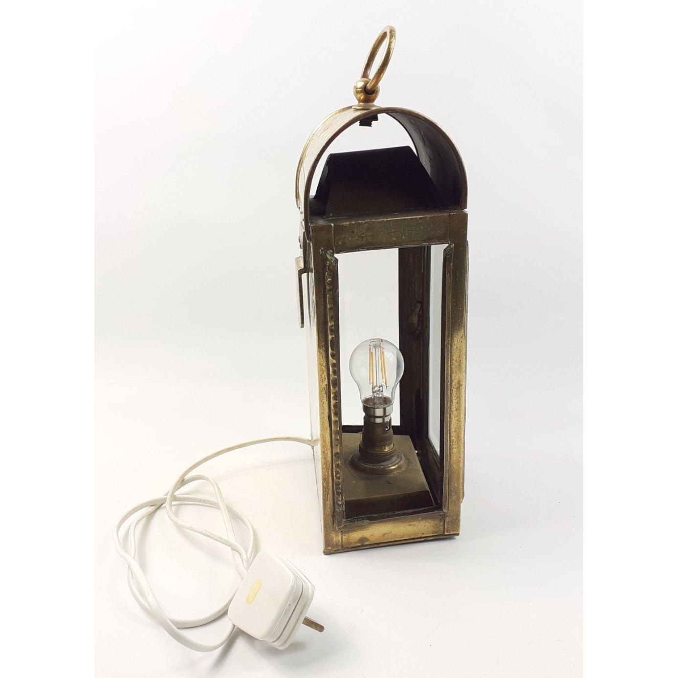 A brass coaching lamp, converted to electricity, intact glass, a few cracks to internal reflector. Stands approx 35cm highApprox 1 pieces