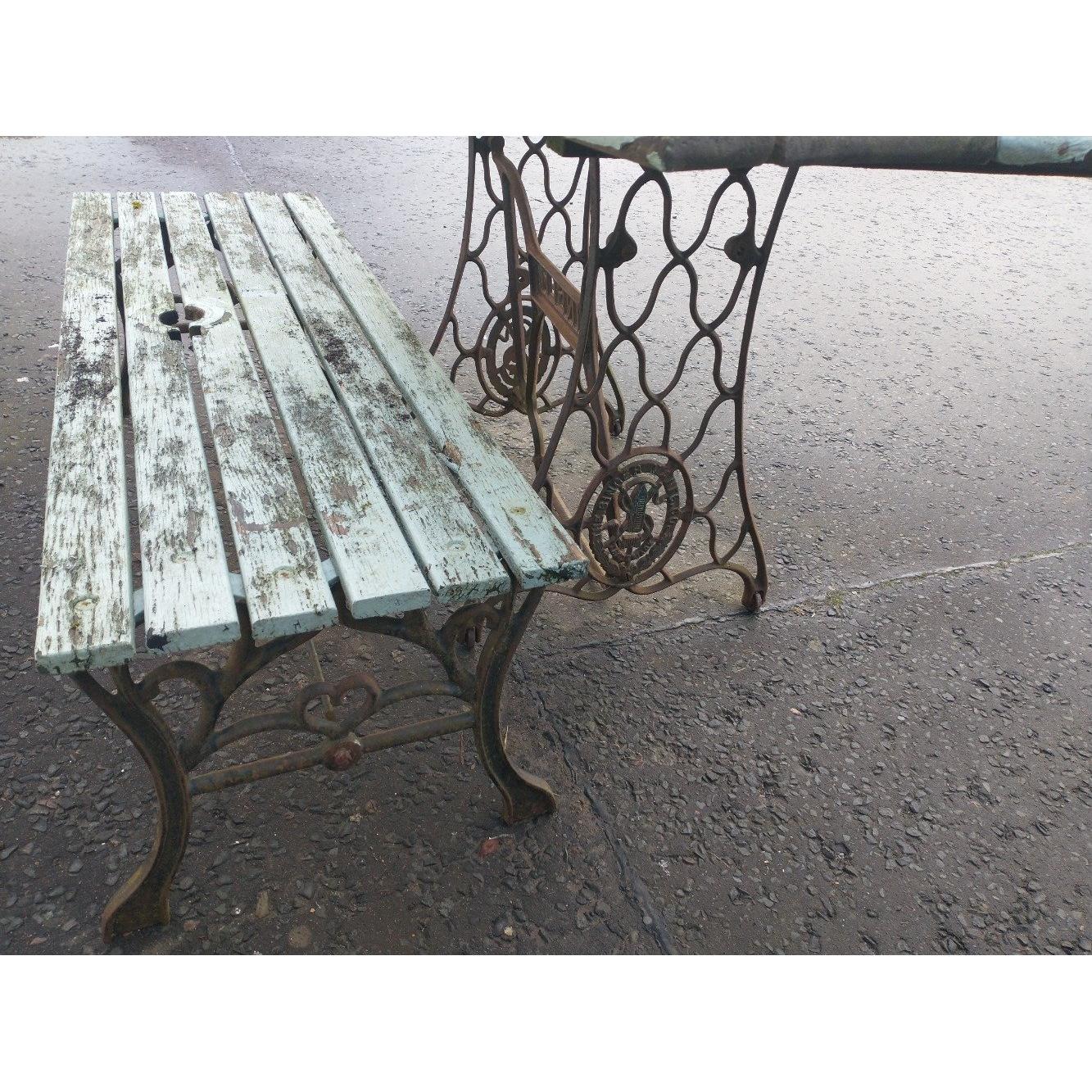 Outdoor table and bench with wooden tops. Table with Singer treadle legs and bench with iron legs. Table dimensions: W: 150cm H: 74cm D: 70cm approx. Bench dimensions: W: 123cm H: 74cm D: 70cm approx