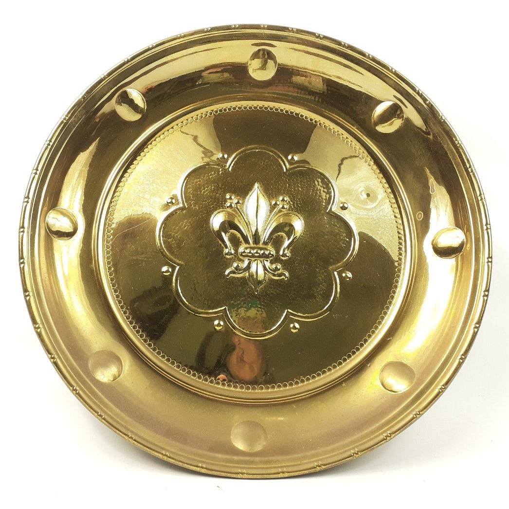 A mixed metalware lot to include a 40cm brass wall tray with fleur-de-lys design, 3 toasting forks and a copper skimmer and a Victorian crown brass epaulette