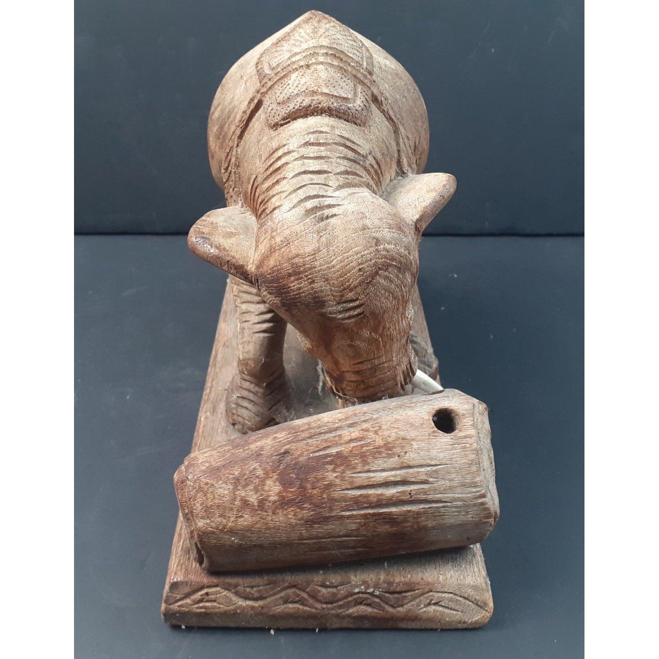 A beautifully sculpted hardwood elephant pushing a log, possibly had harness fitments, W26cm H20cmApprox 1 pieces
