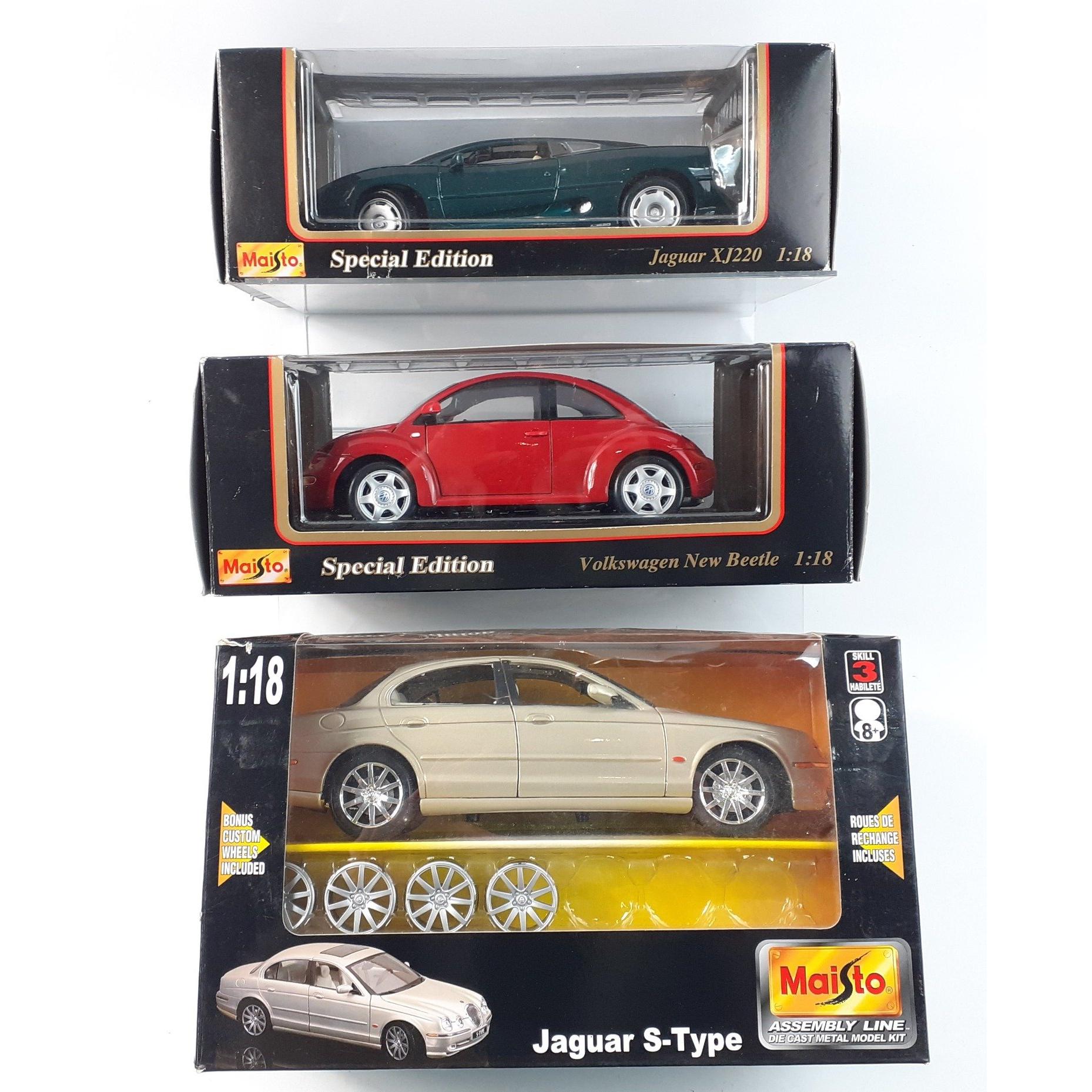 Three boxed diecast vehicles comprising a MAISTO Jaguar XJ220, and a VOLKSWAGEN New Beetle as well as a MAISTO Jaguar S-type from the Assembly Line seriesApprox 3 pieces