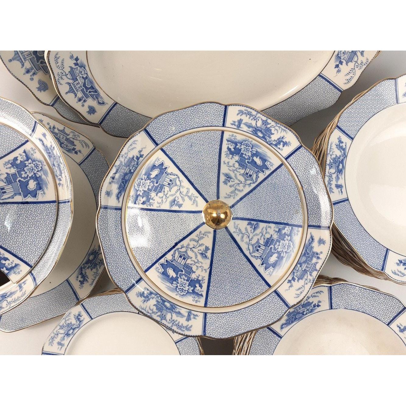 A large ALLERTON'S blue and white dinner service in the Pavilion pattern to include a pagoda tureen and 2 pagoda lidded serving dishes, 3 graduated ashets, 12 each of soup plates, side plates, dinner plates, dessert plates plus a sauceboat with underplate