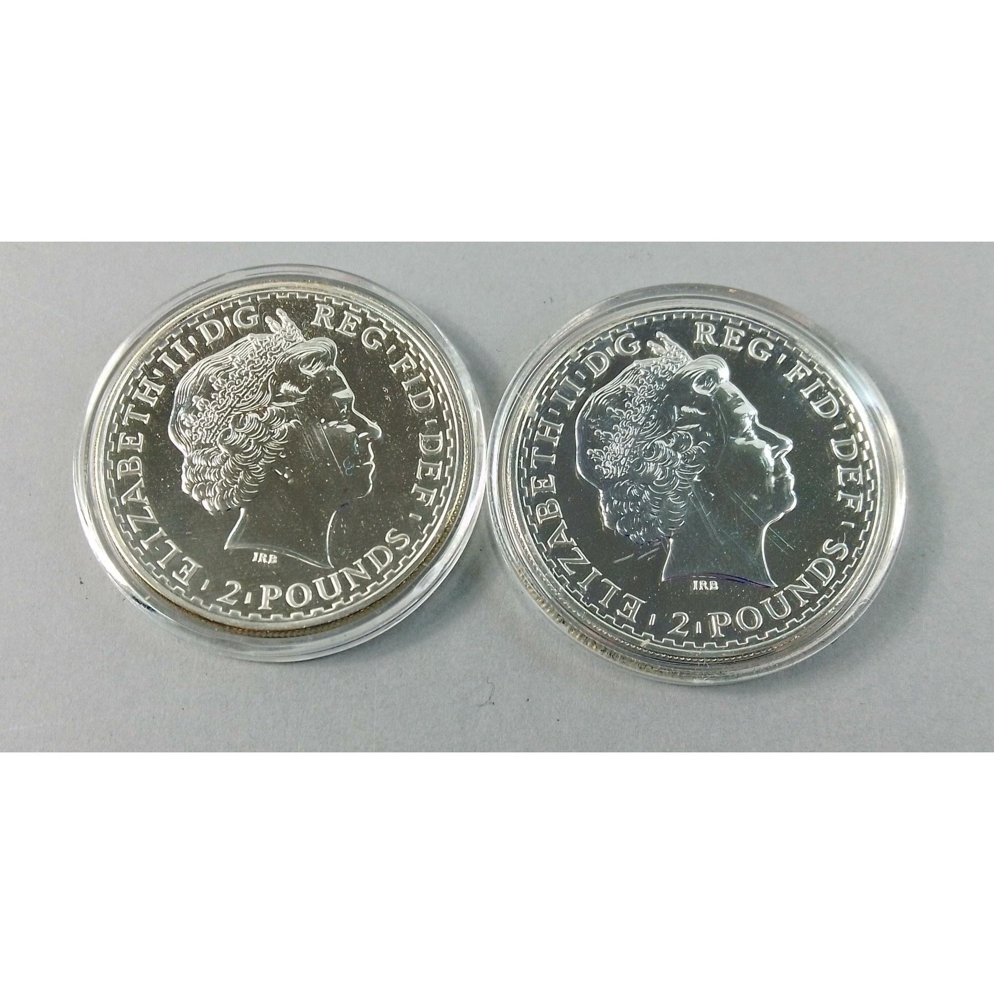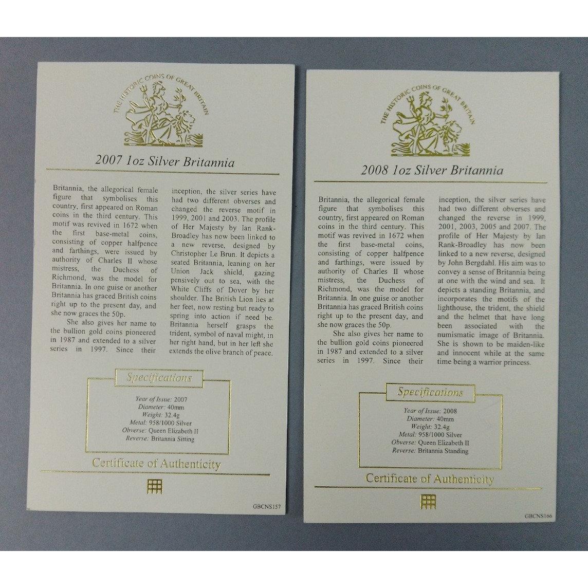 A 2007 and a 2008 silver BRITANNIA with certificates showing the two reversesApprox 2 pieces