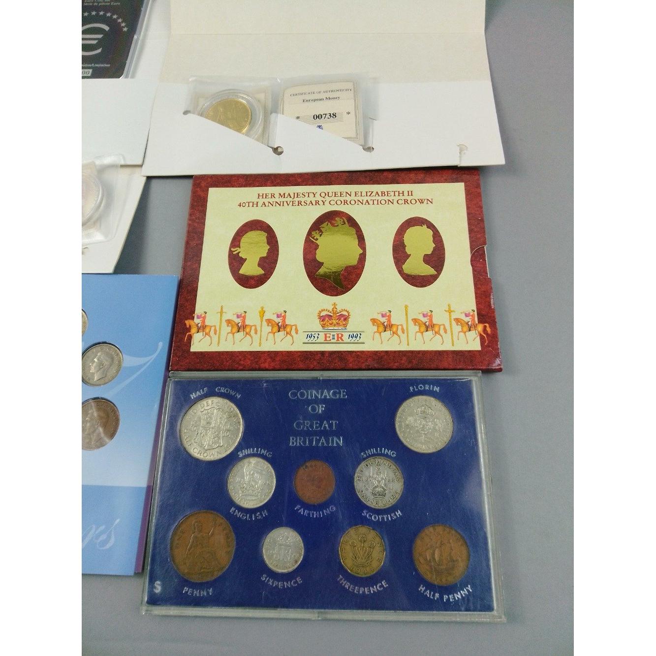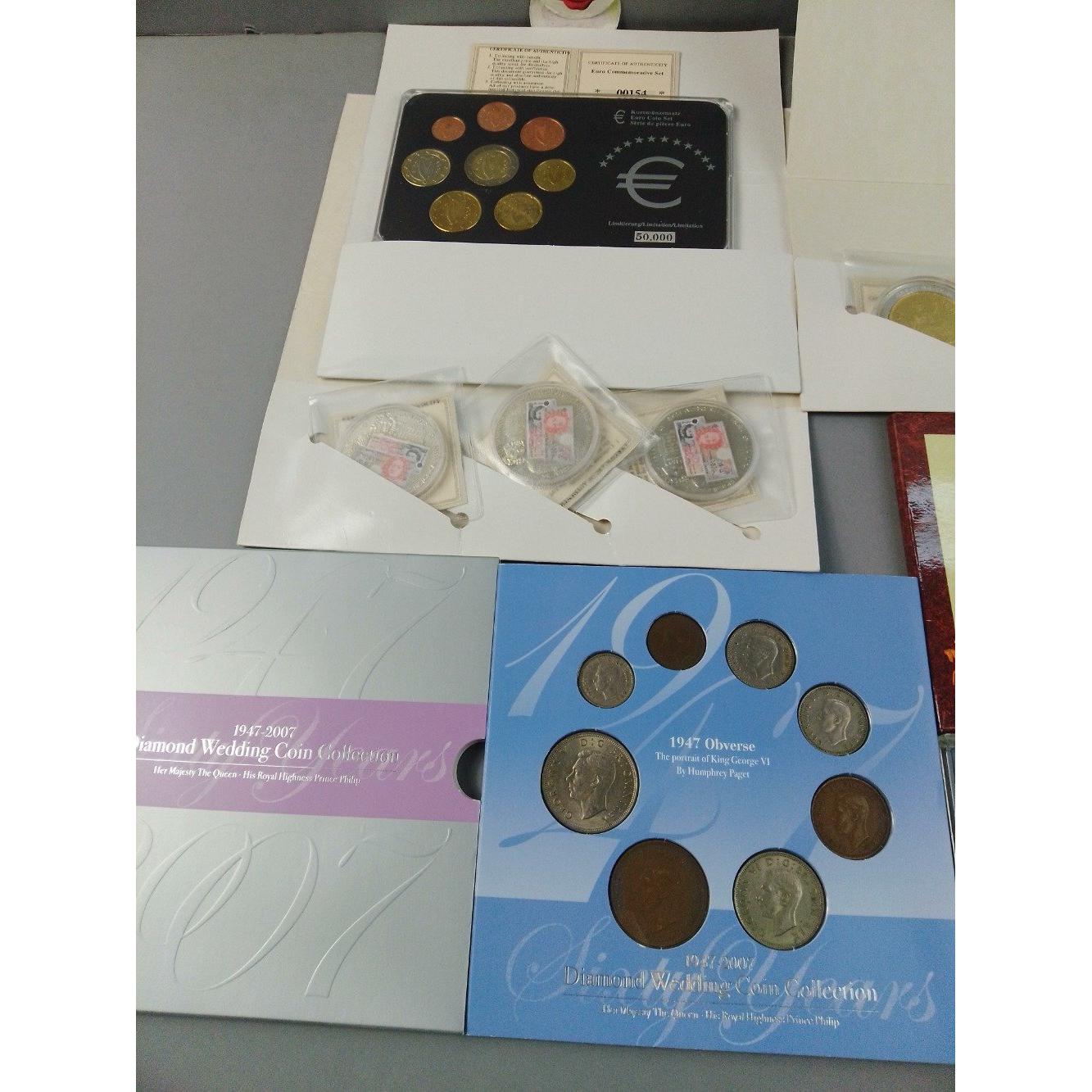 A selection of commemorative coins to include 1947-2007 Diamond wedding collection, 1993 commemorative five pound crown, a limited edition Euro set, a selection of plated coins, and a 1944 coins of Great Britain