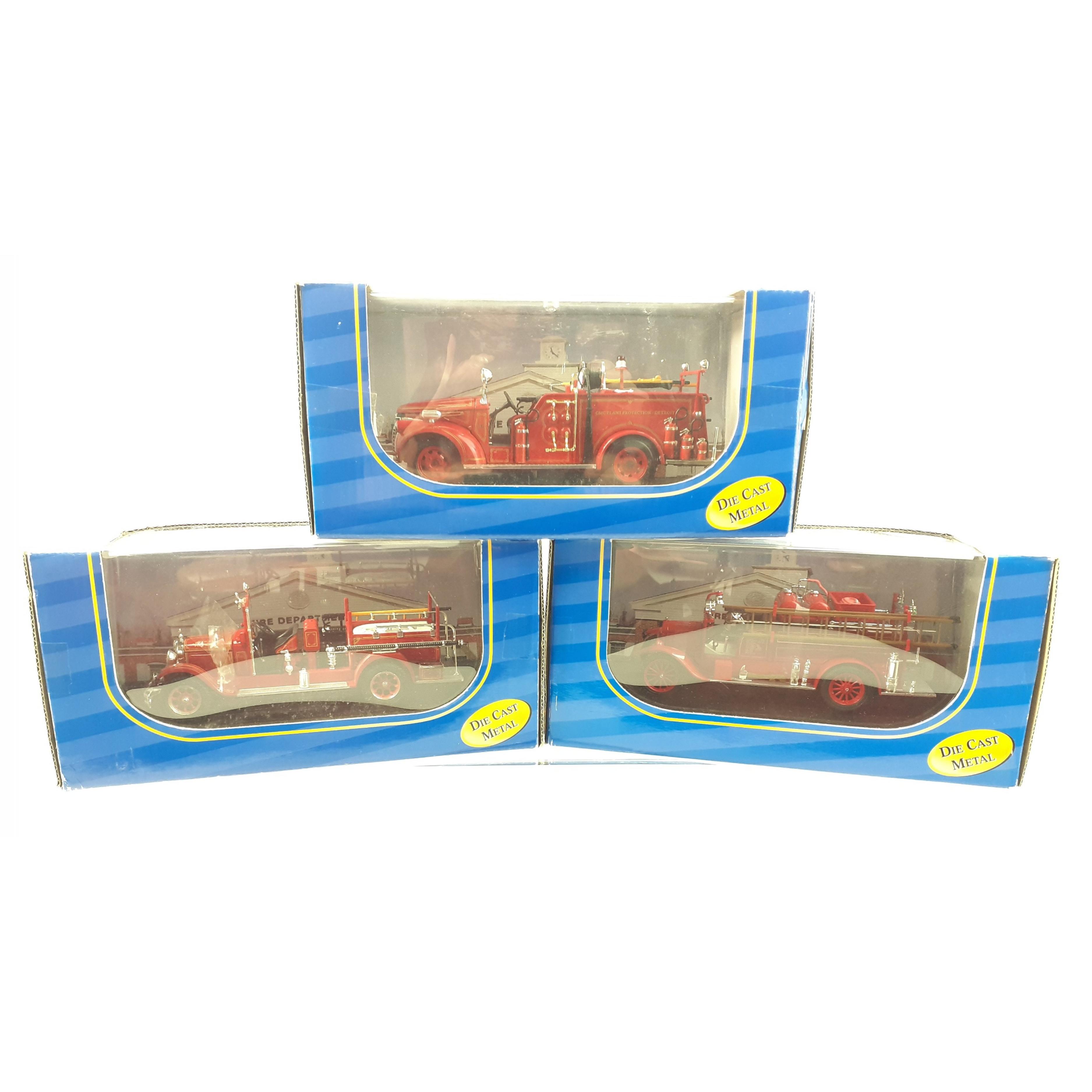 Three AMERICAN MINT premier edition FIRE TRUCKS in original packaging to include a 1926 Model T fire truck, 1928 Studebaker, and a 1941 GMCApprox 3 pieces