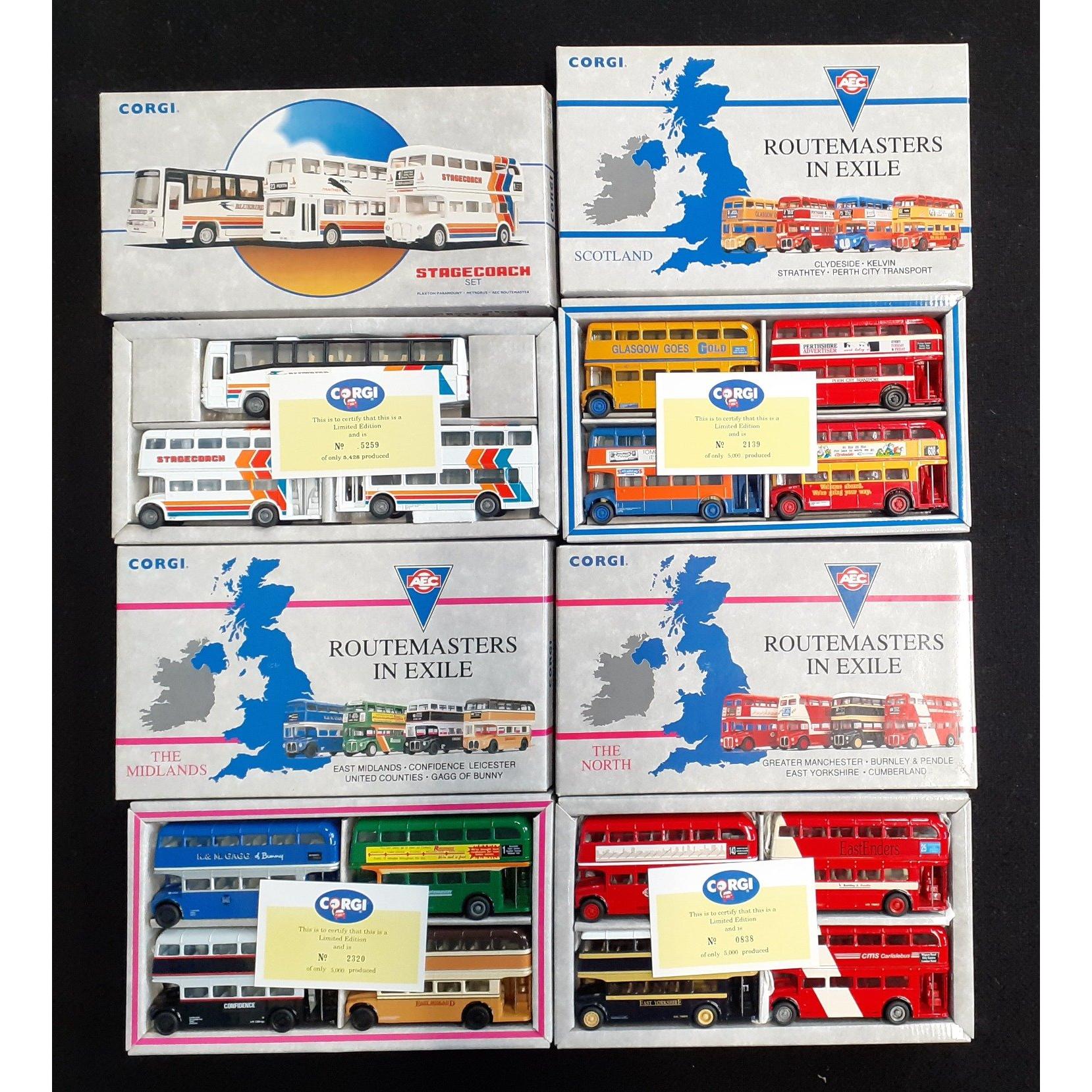 A lot of three CORGI limited edition ROUTEMASTERS IN EXILE sets to include Scotland, the North and the Midlands, plus a CORGI STAGECOACH set Approx 4 pieces