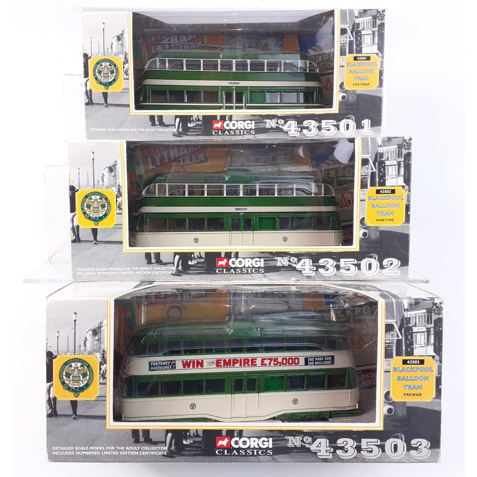 Three CORGI CLASSICS to include Blackpool Balloon Trams, 43501 post war, 43502 wartime, 43503 pre-war all in original boxesApprox 3 pieces