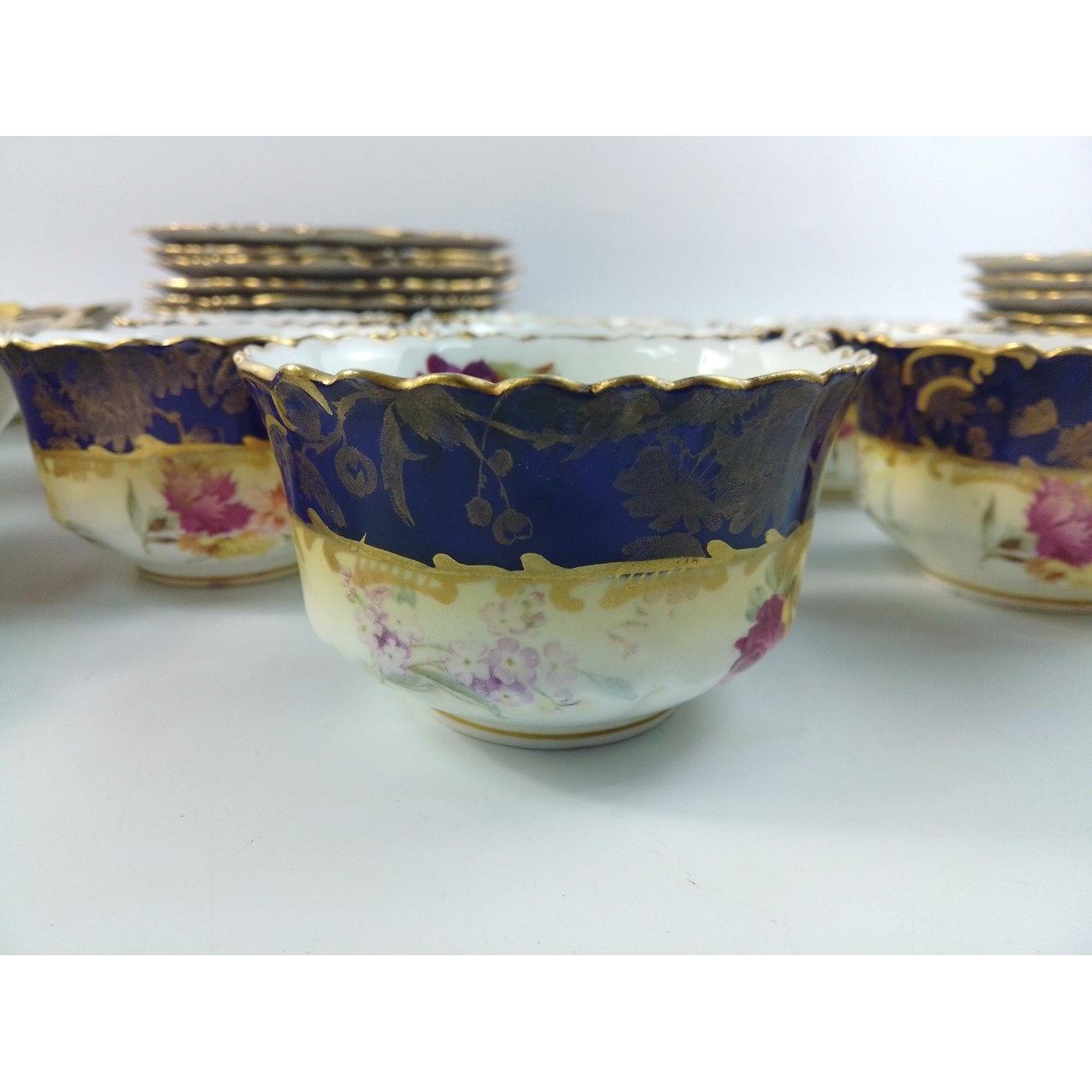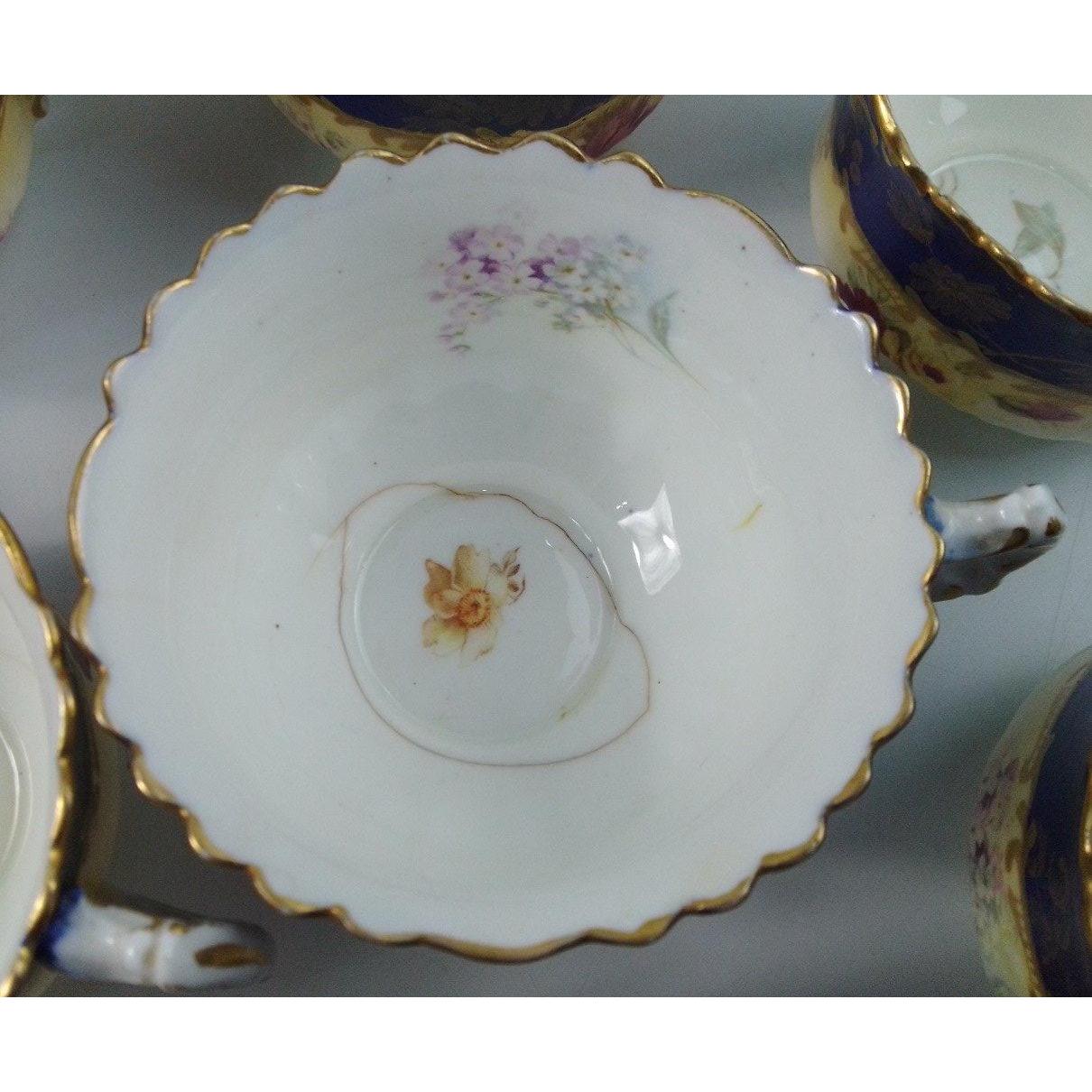 A pretty vintage tea service in cobalt blue with gilt edgings to include 7 cups, 10 saucers, 11 side plates, plus 2 decorative plates and 2 oval bowls. Three cups have some cracks and a couple have stains from use but remain attractive items.