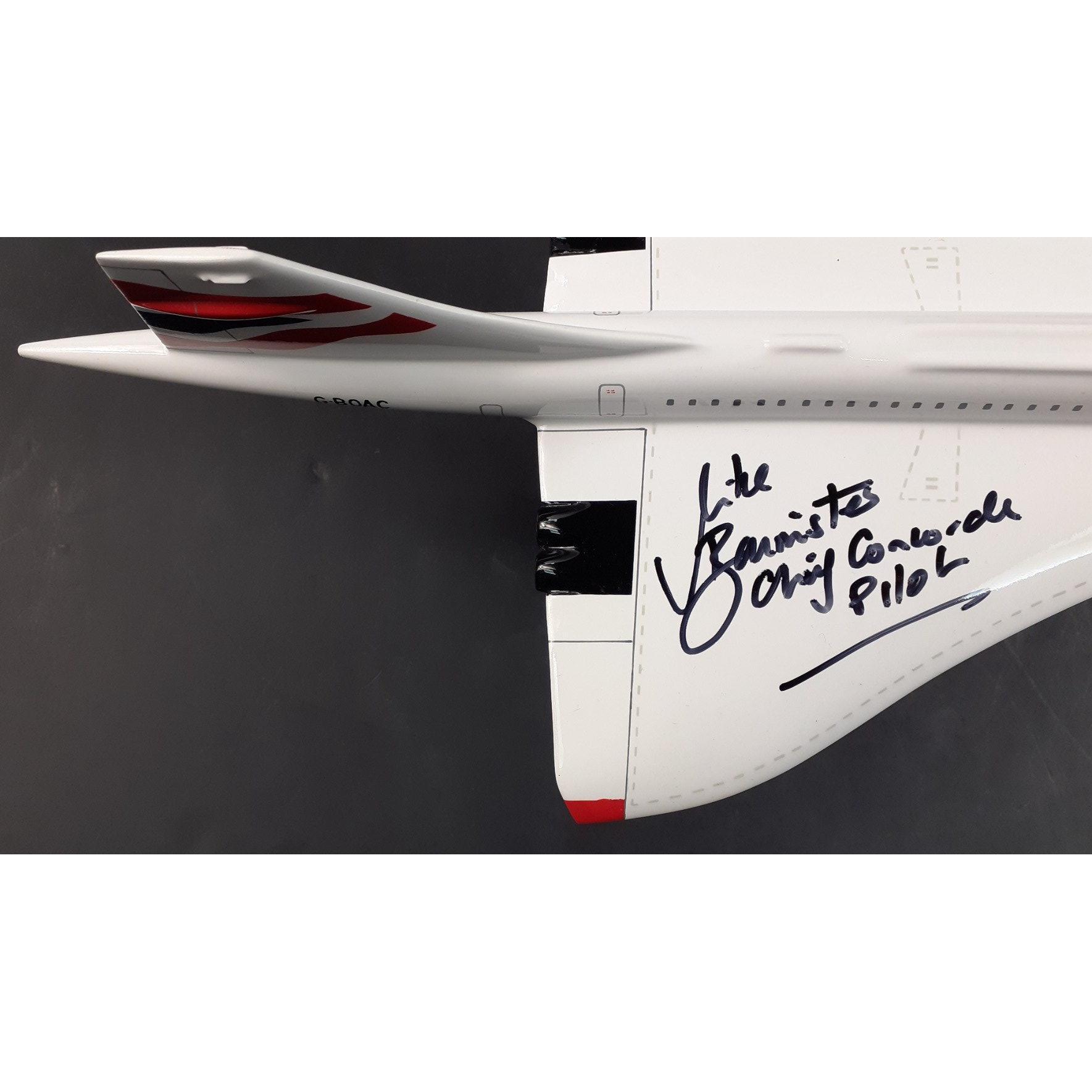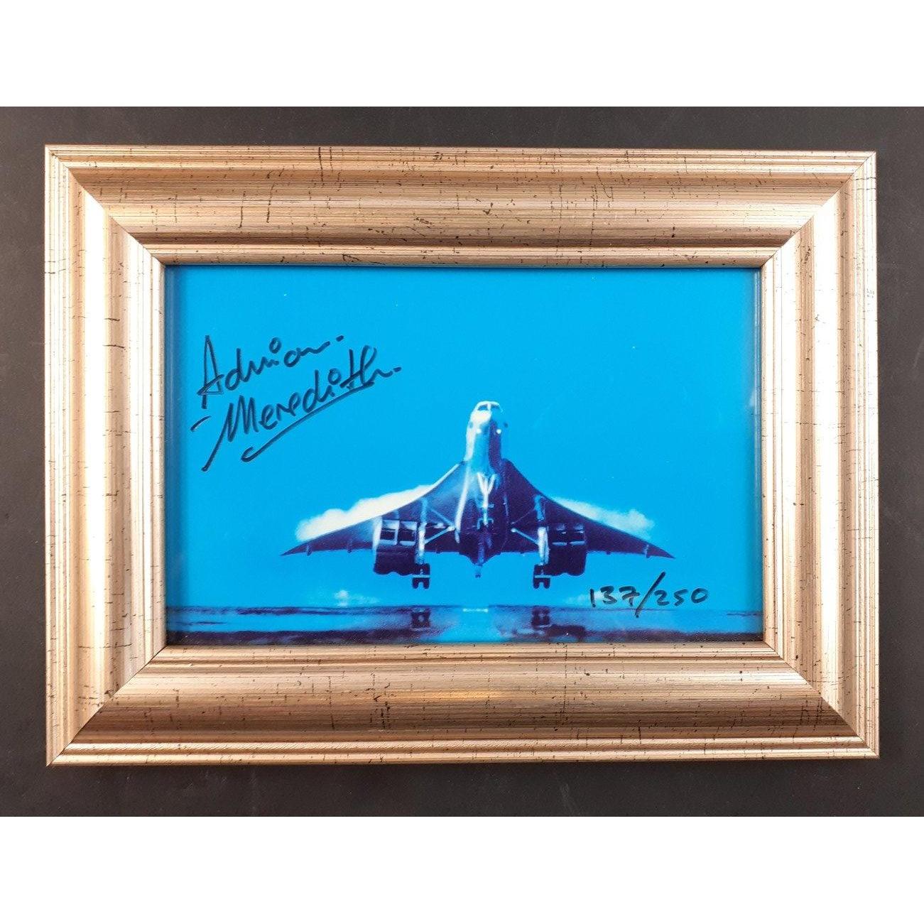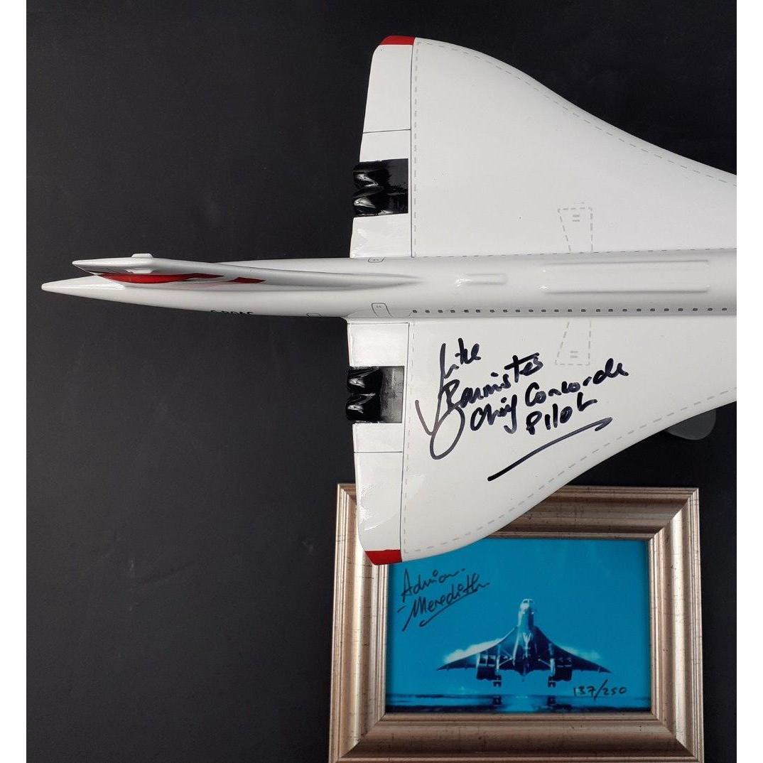 A signed pilot CONCORDE aeroplane model and accompanying limited edition (137/250) framed photograph signed in black marker pen by photographer ADRIAN MERIDETH showing Mike Bannister chief pilot actually piloting the plane! - pilot Mike Bannister - born May 1949 is an airline pilot. He is best known as the Chief Pilot of British Airways' Concorde fleet, a post which he held from 1995 until its withdrawal from service in 2003.