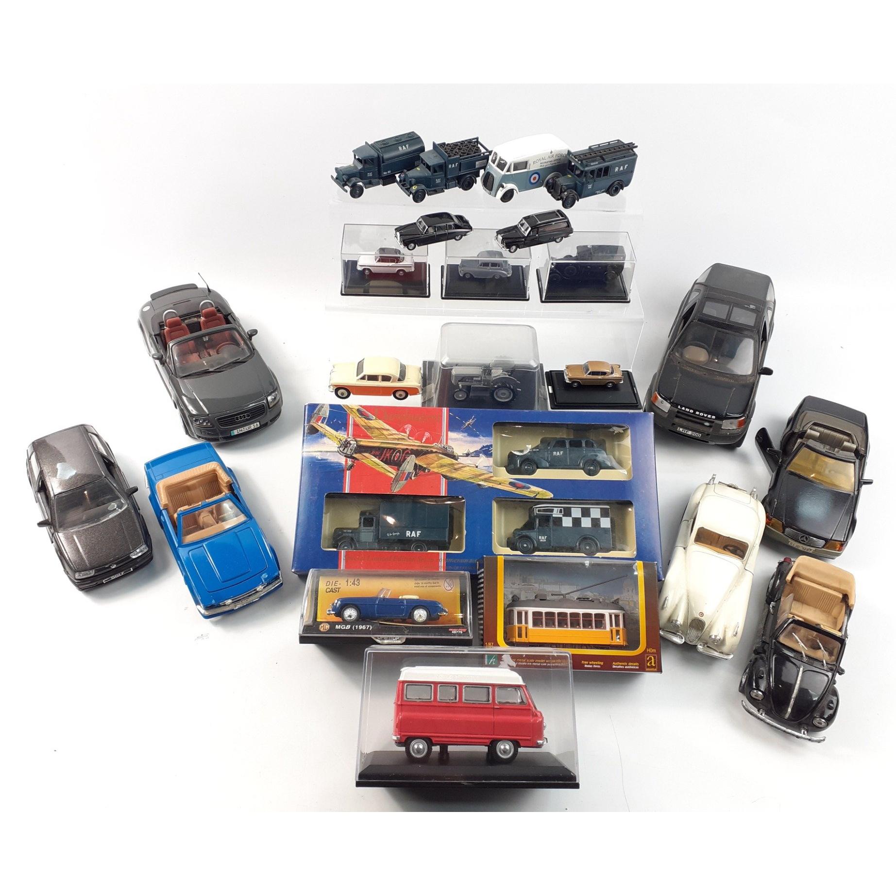 A selection of diecast models to include a large Range Rover, an unboxed Maisto Audi, others from display, a boxed Lledo Dambuster set and various other used models
