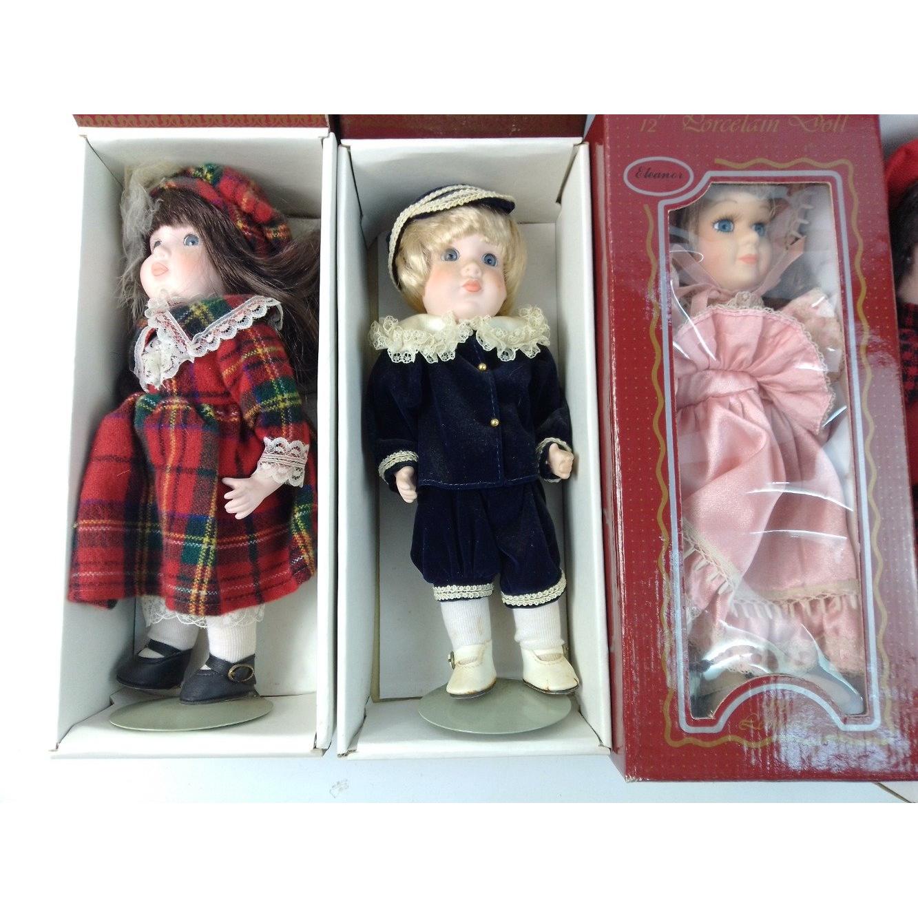 Five ALBERON COLLECTABLE DOLLS each 10" high, on stands. Dolls in good condition. Boxes with wearApprox 5 pieces