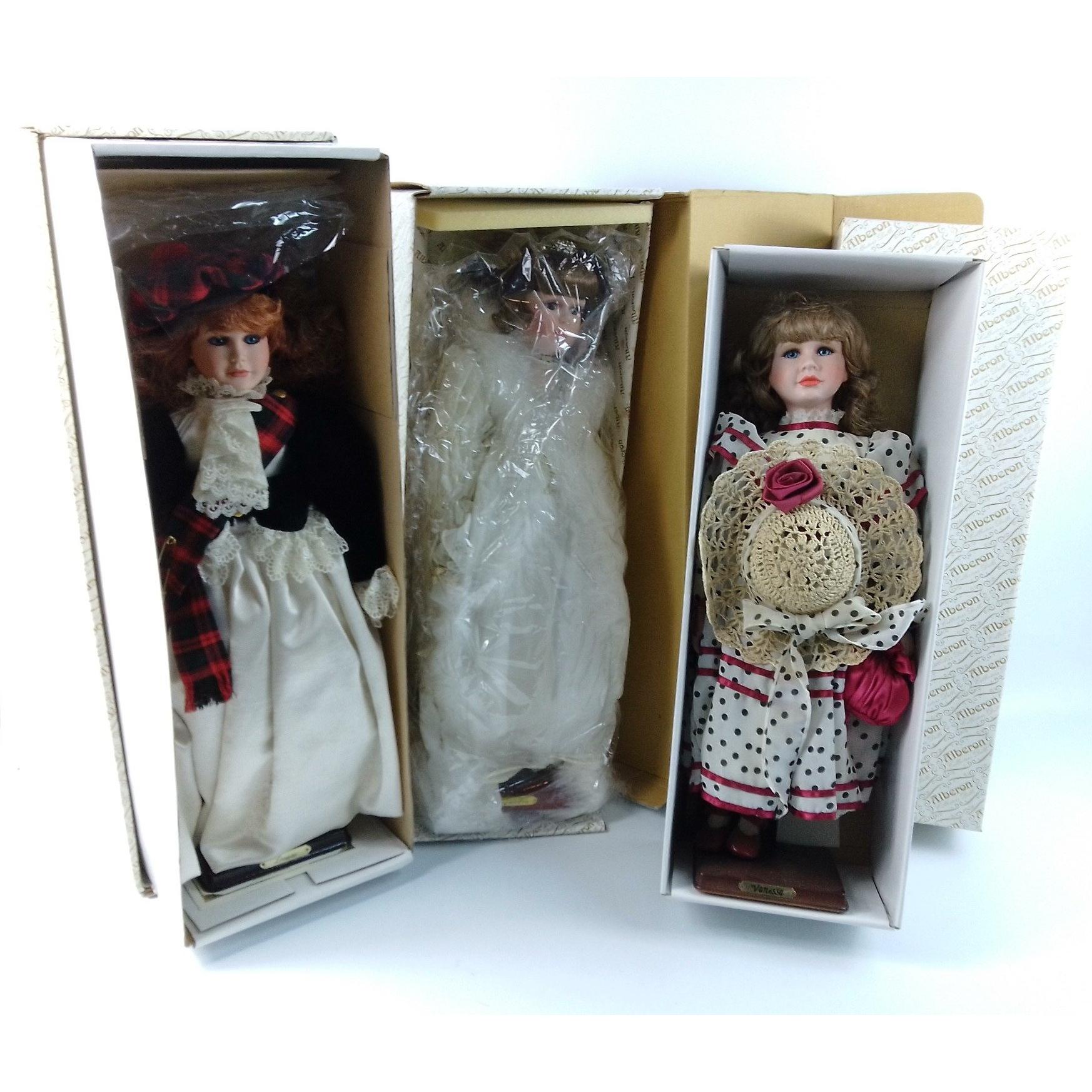 Three ALBERON COLLECTABLE DOLLS on stands including Vanessa (20"), Alexandra and Lorraine (21"). Dolls in good condition. Boxes with wearApprox 3 pieces