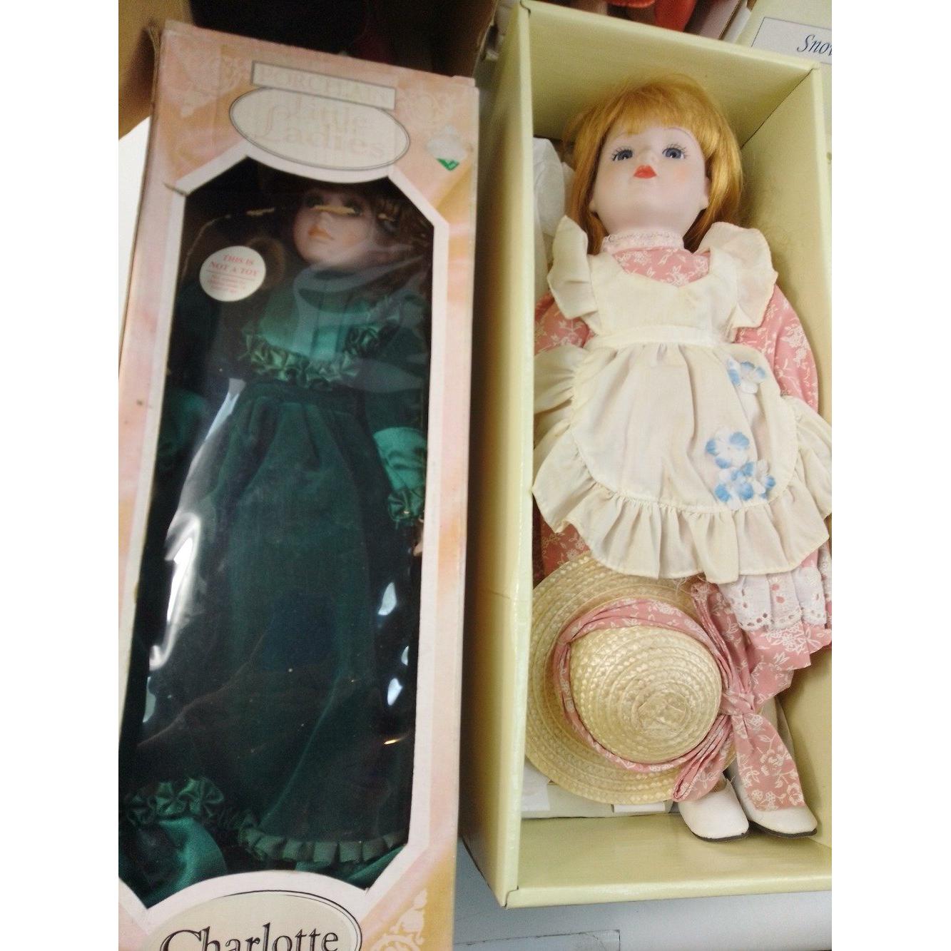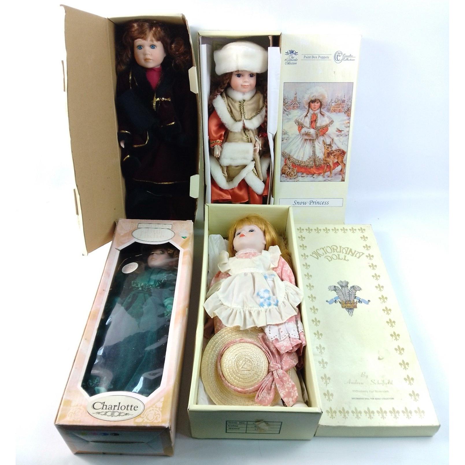 A collection of 4 collectable decorative dolls to include one RIVENDELL Victoriana doll by Andrew Schofield (16"), LEONARDO Snow Princess (13"), House of VALENTINA Flona similar size. Dolls in good condition, boxes with wear from storage