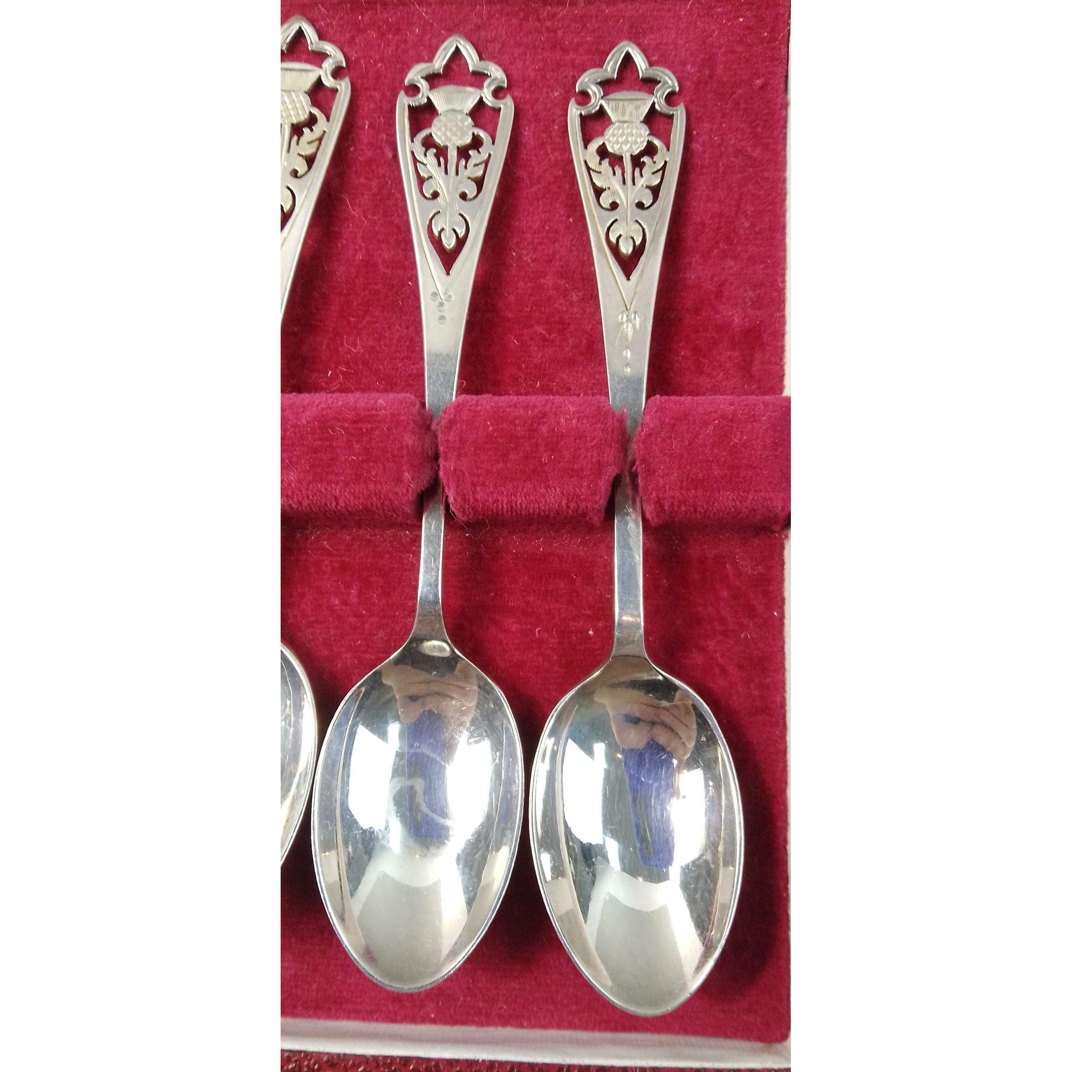 A beautiful set of twelve solid silver coffee spoons with thistle cut motif, hallmarked EDINBURGH with various 1970s dates, all matching patterns, weight 139g approx Approx 1 pieces