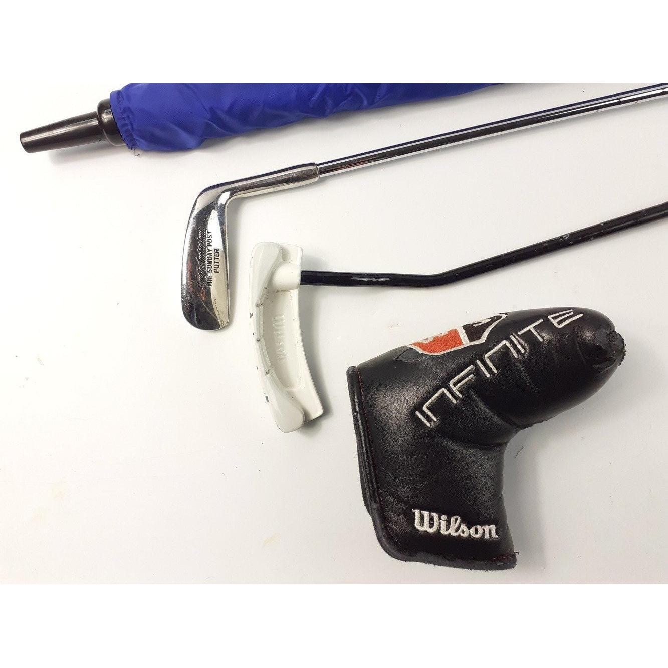 A WILSON Sam Torrance belly putter and a LAWRIE AUCHTERLONIE Sunday Post putter with chamois handle and a golf umbrellaApprox 3 pieces