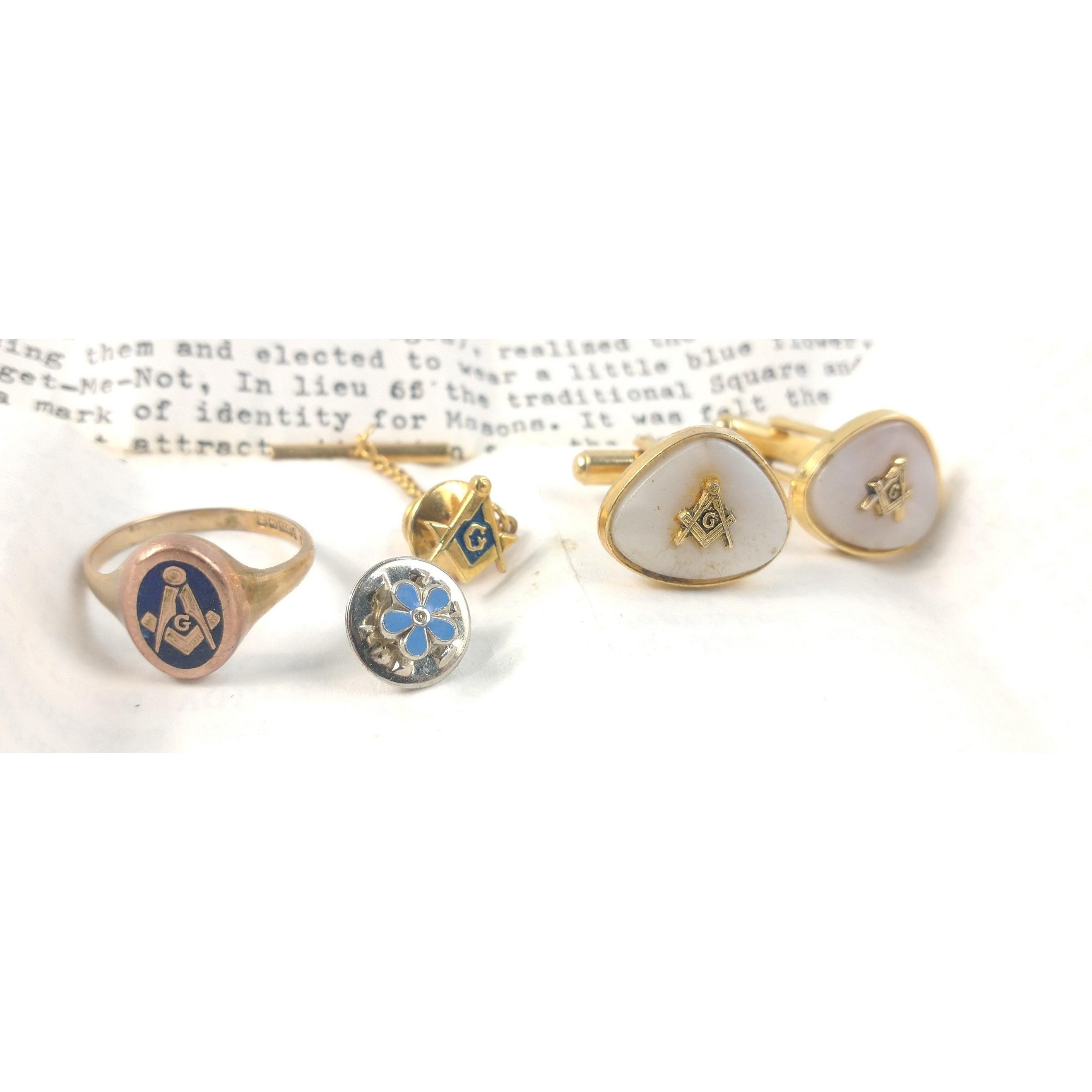 A fully hallmarked (Birmingham) Masonic ring, size T, gross weight 4.80g approx with cufflinks and tiepin and also a forget-me-not pin badge with accompanying explanation of its use during the Third Reich