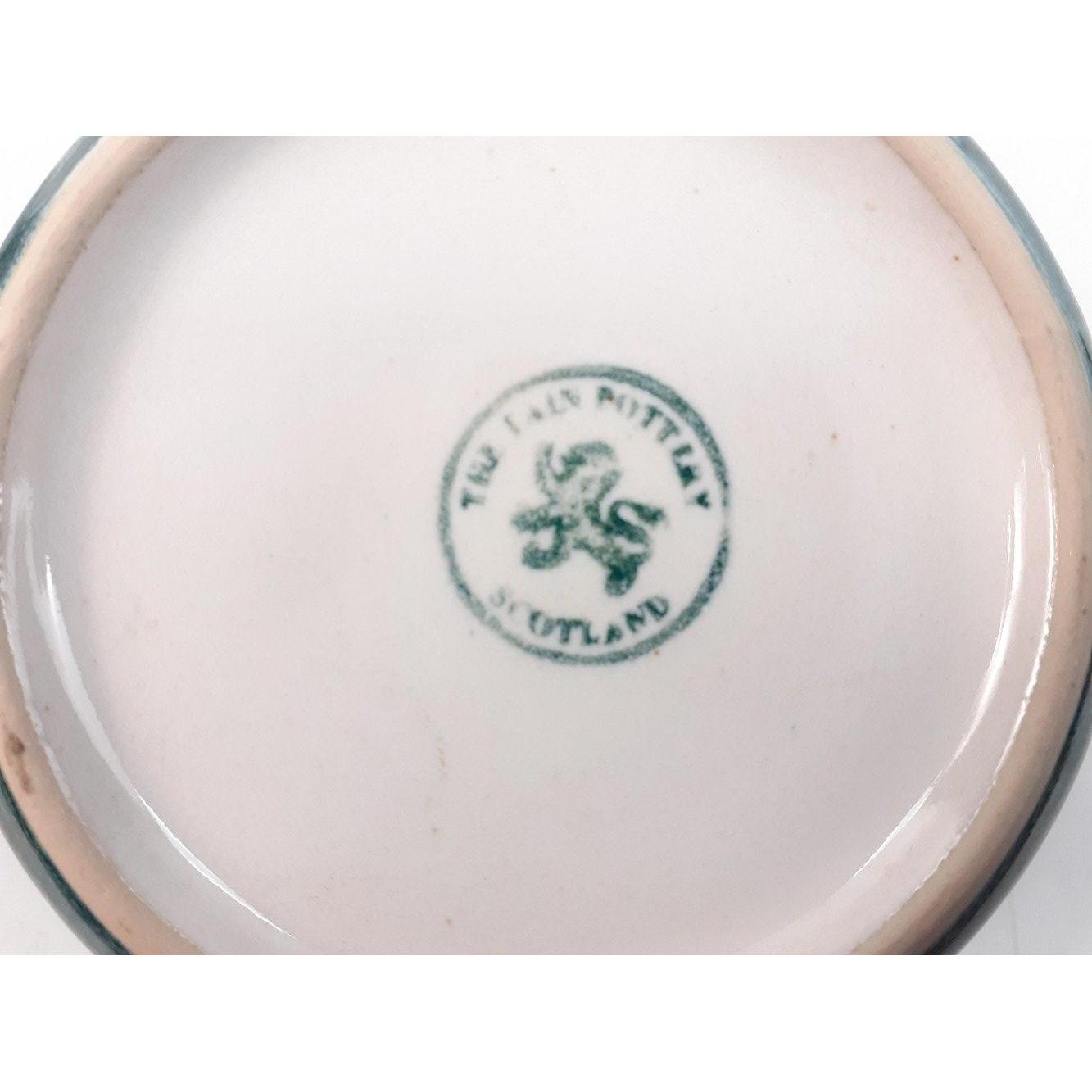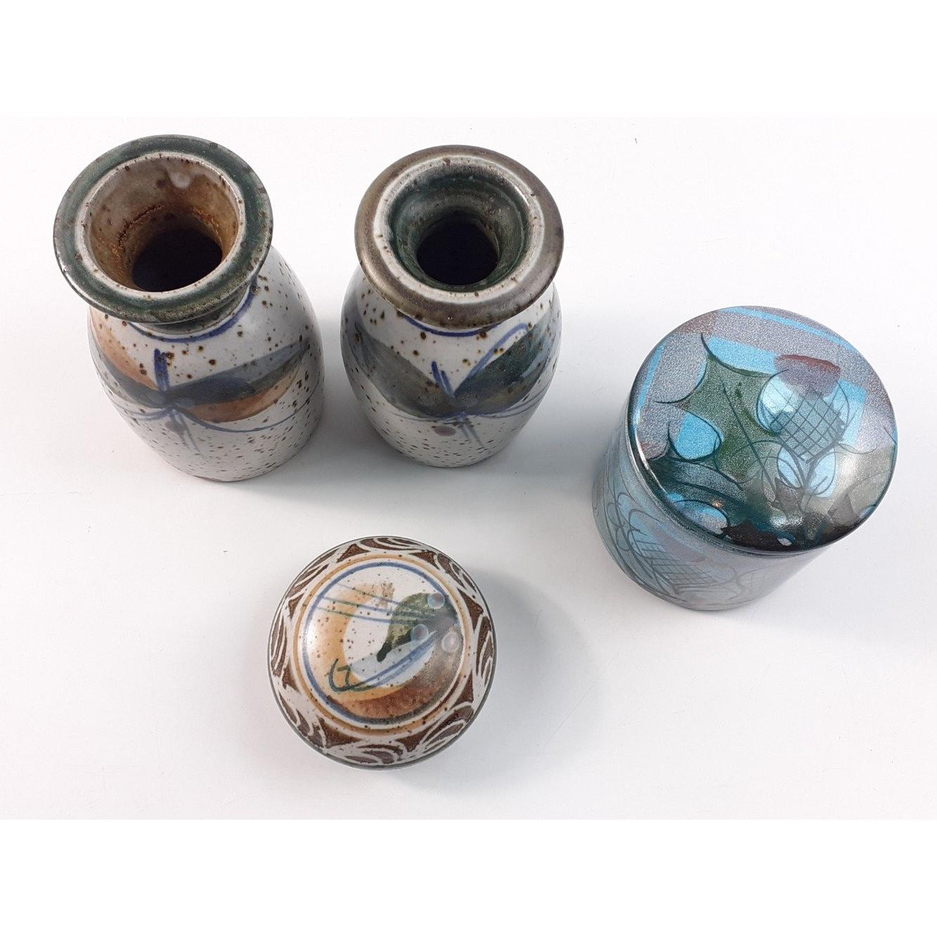 Four pieces of studio pottery to include a pair of vases 13 and 14cm high, with a matching lidded trinket dish 9cm approx and also a glazed pottery jar with lid decorated with thistles 10cm diameter 10cm height approx