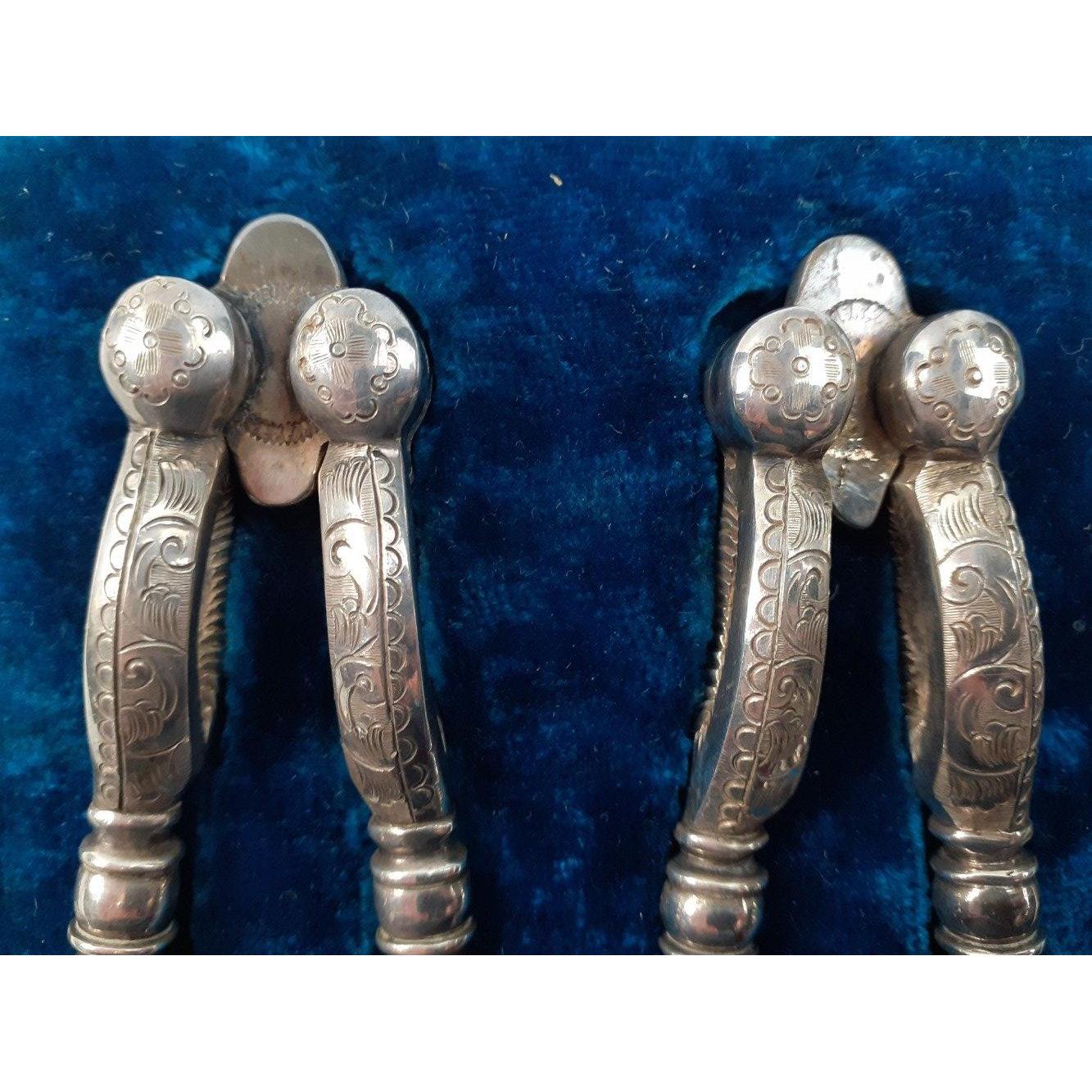 A beautiful pair of white metal nut crackers presented in a box lined with velvet and satin. No maker's mark but at some time someone has given great attention to detail to produce these lovely items.