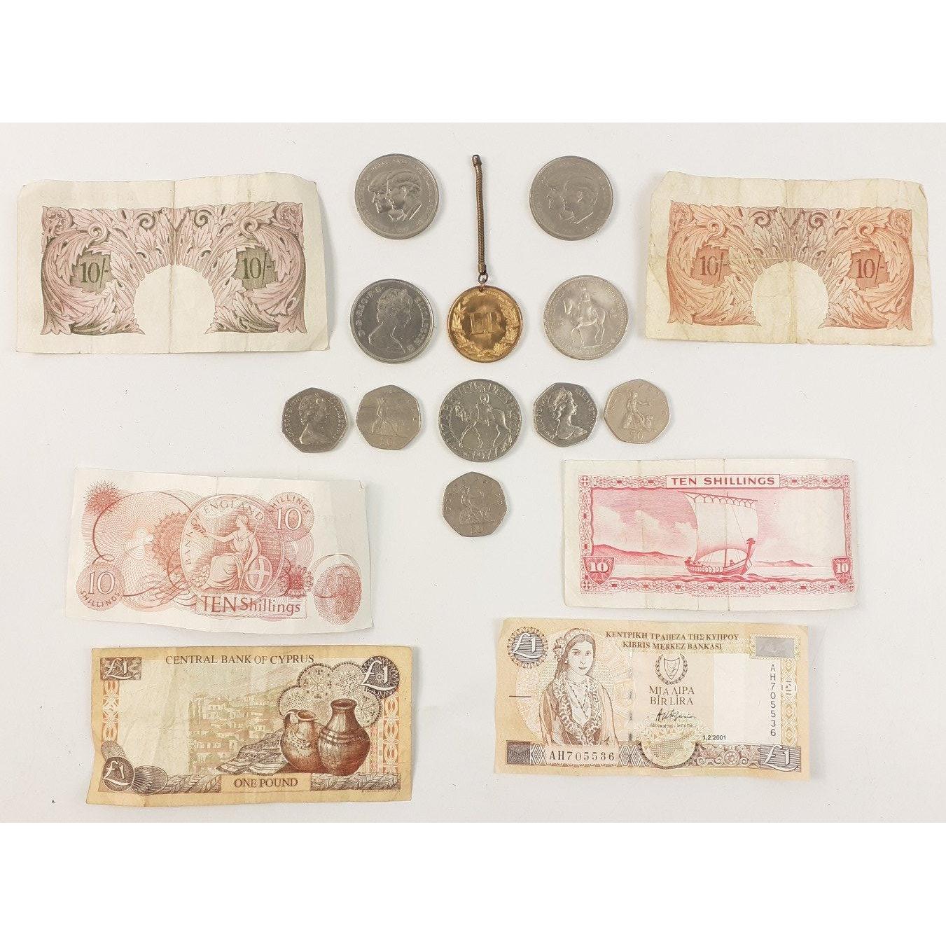 A lot comprising a quantity of coins and bank notes of interest to include 10/- banknotes amongst others. Coins include several crowns and 5 x obsolete 50p's