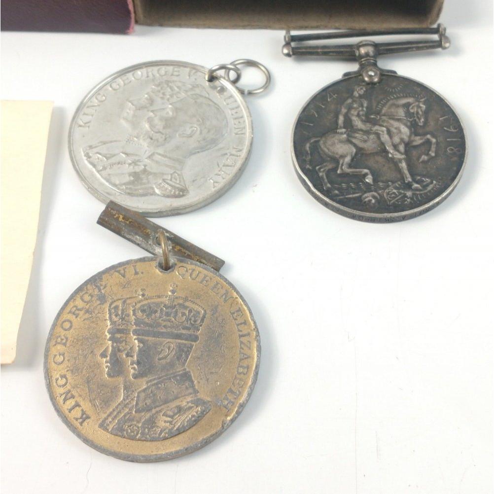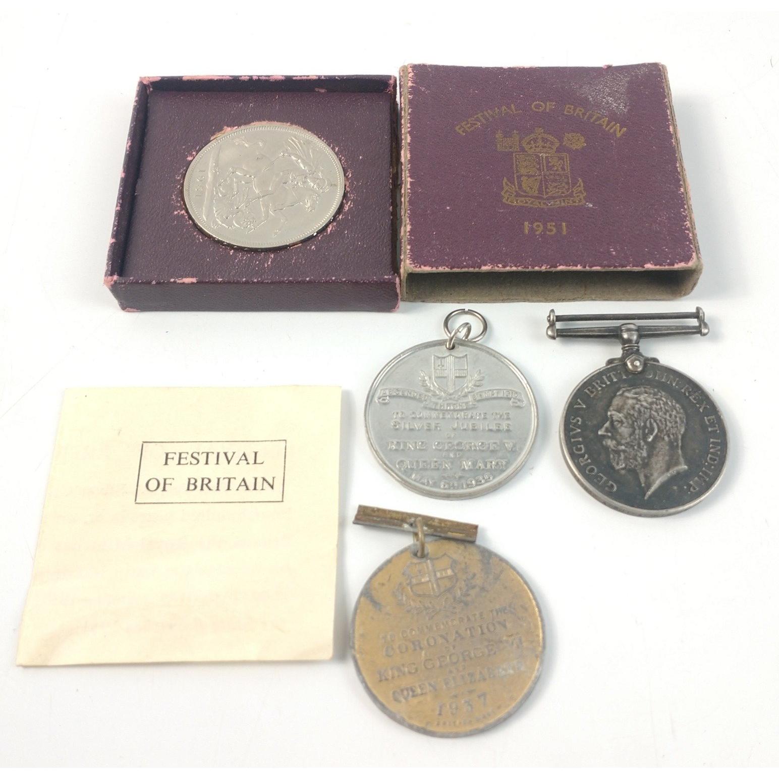 A WWI British War Medal to 113832 ASGT Skirrow, Royal Army Medical Corp. Also 2 x 1930s commemorative medallions and a 1951 Festival of Britain Crown Approx 4 pieces