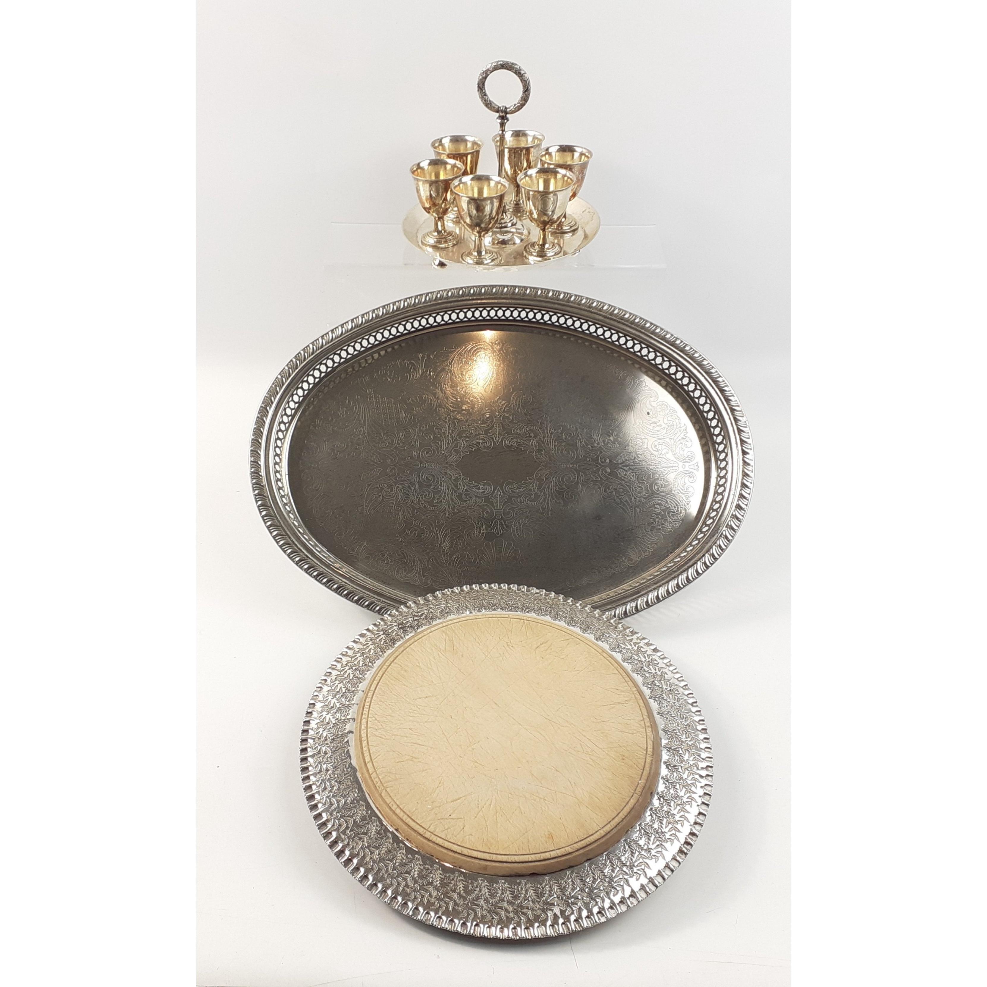 A small EP lot to include a 40cm pierced tray, a wooden centred cheeseboard, a set of 6 egg cups on tray