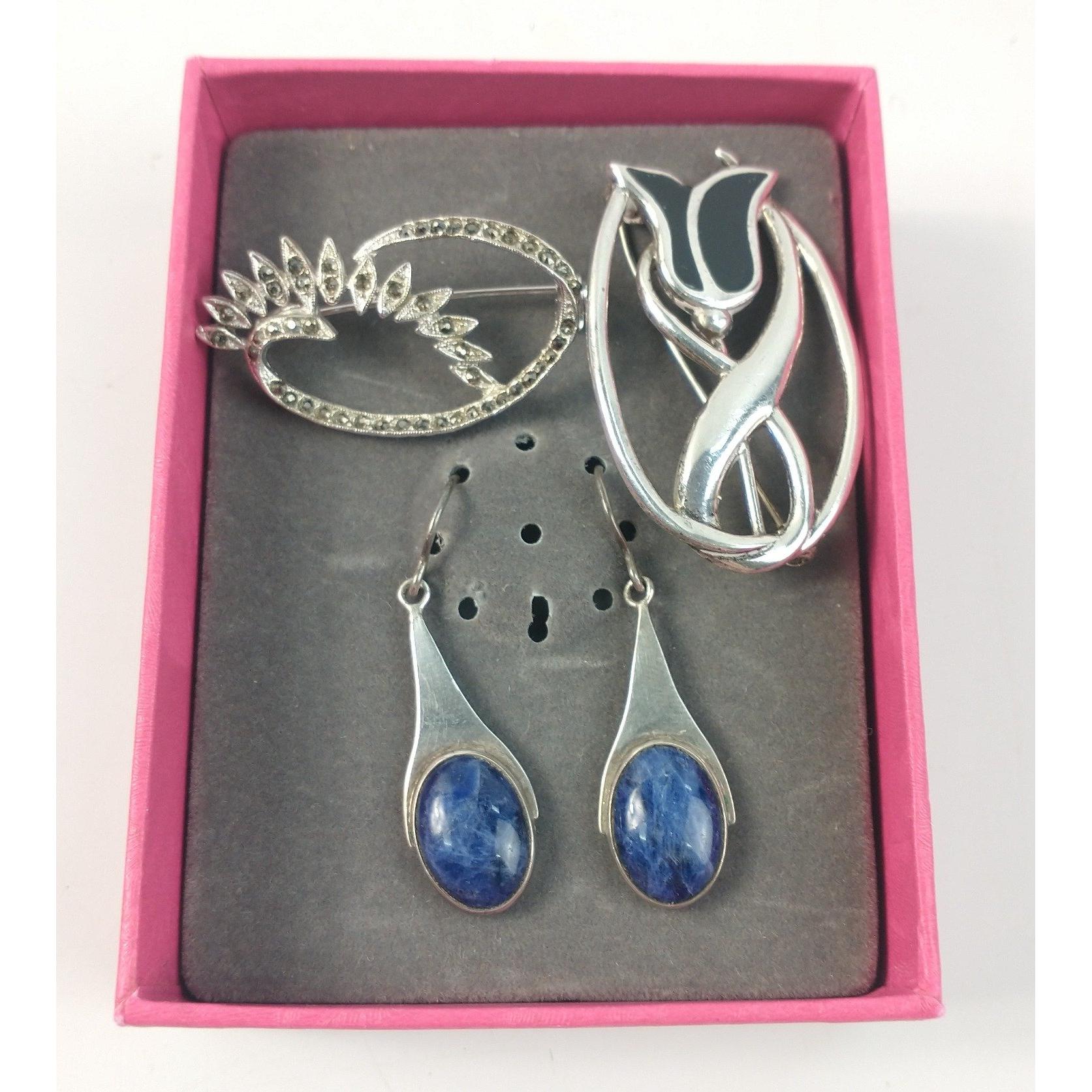 A fully hallmarked, rather lovely MACKINTOSH style Deco brooch and a set of 925 stamped lapis earrings, gross weight 12.7g approx, plus 1 other base metal brooch