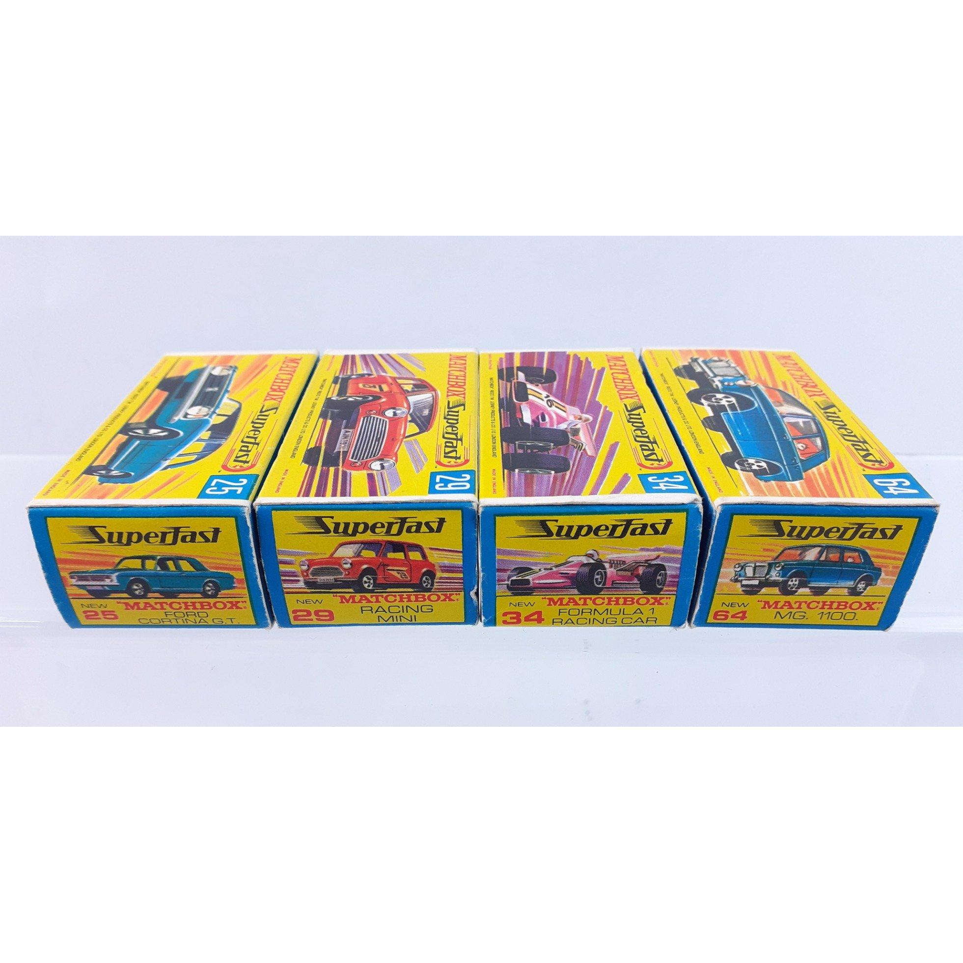 Four MATCHBOX SUPERFAST models in wonderful condition in intact original boxes, all flaps intact to include 25 FORD CORTINA GT, 29 MATCHBOX RACING MINI, 34 FORMULA 1 RACING CAR, and 64 MG1100