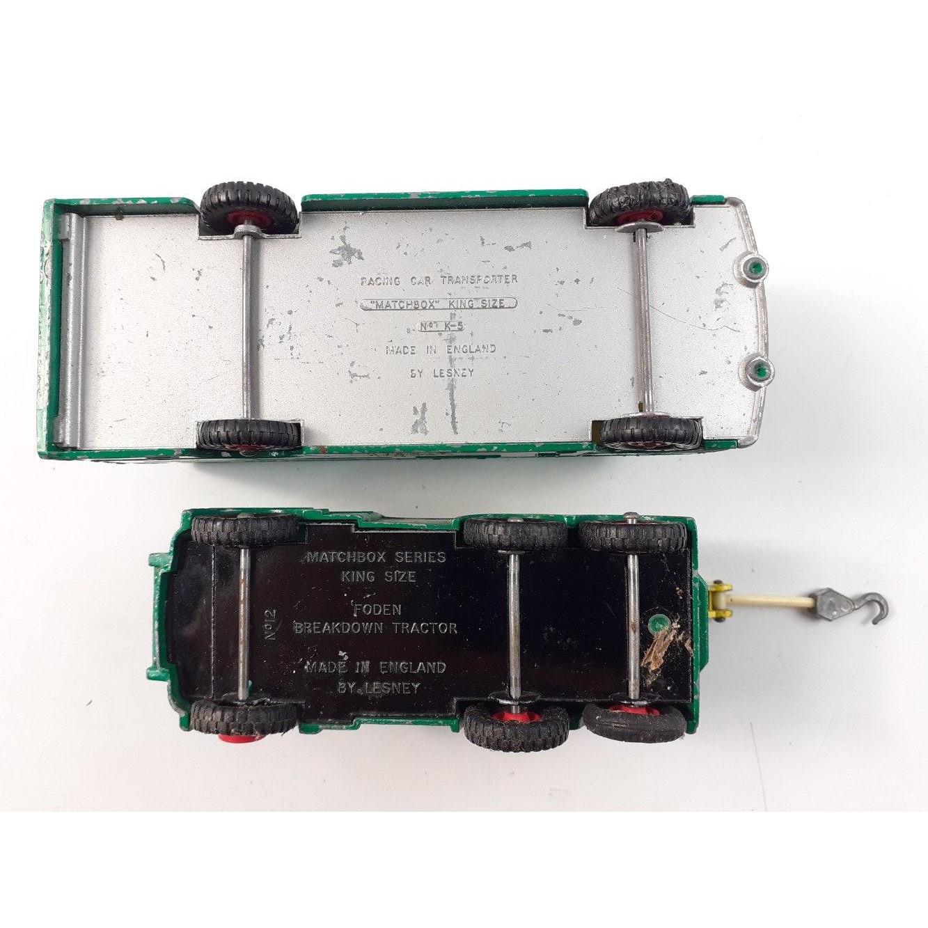 A MATCHBOX Kingsize K5 RACING TRANSPORTER with 2 race cars, and a FODEN breakdown tractor. All with light playwear.Approx 4 pieces