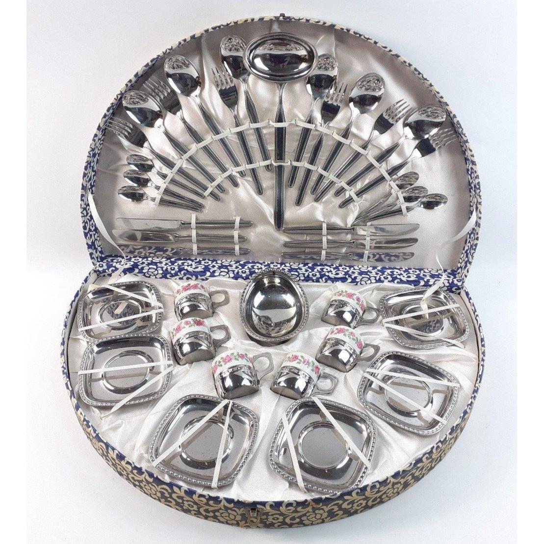 A cased plated JOSEPHIN porcelain breakfast cutlery set with coffee cans. Plus a boxed port decanter setApprox 1 pieces