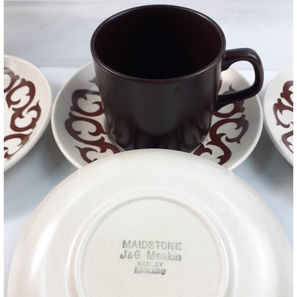 A mixed lot to include a vintage 1970s coffee set to include 1 coffee pot, 6 cups, 6 saucers, sugar and cream, 5 cranberry glass sundae dishes, a set of plated spoons, brassware trumpet vase,