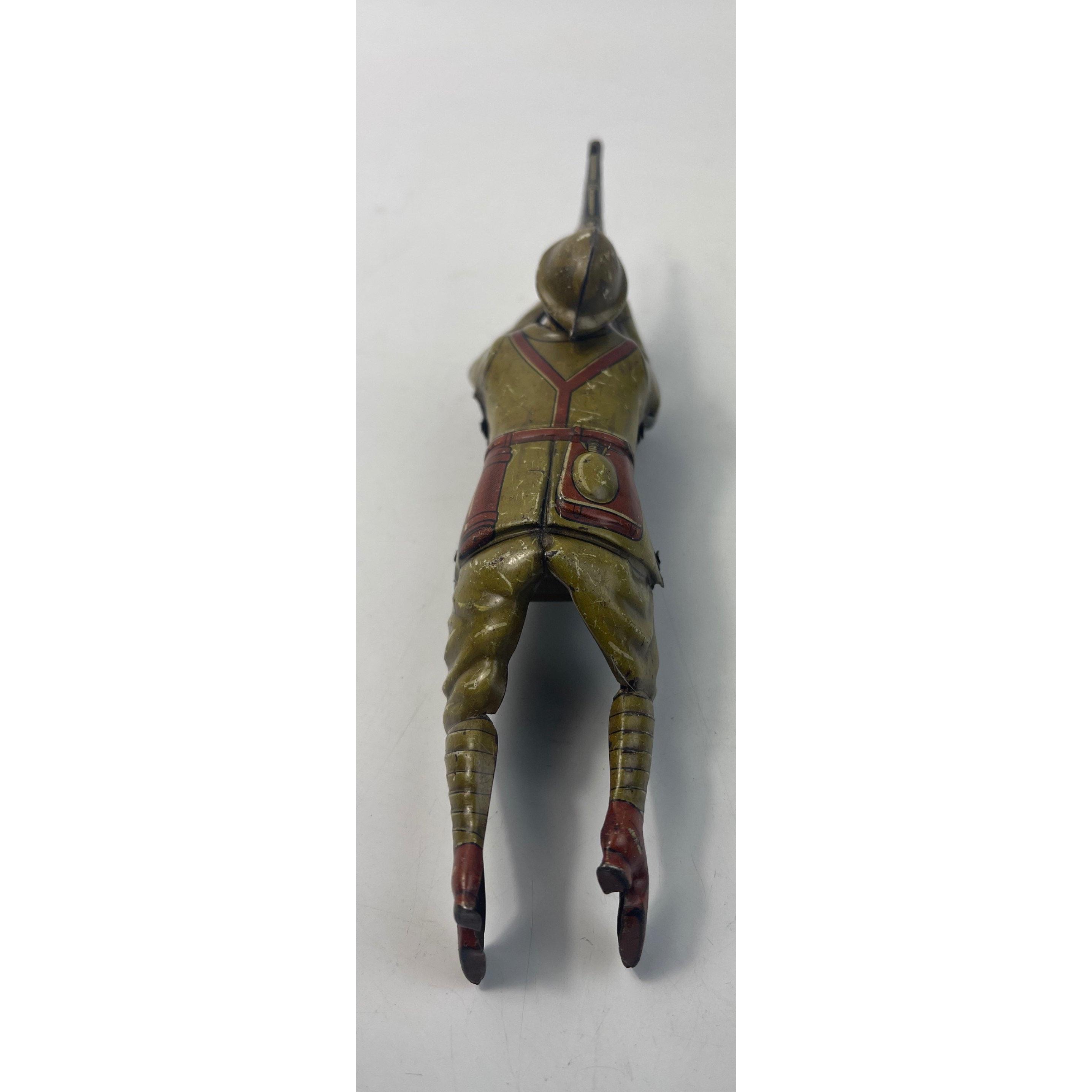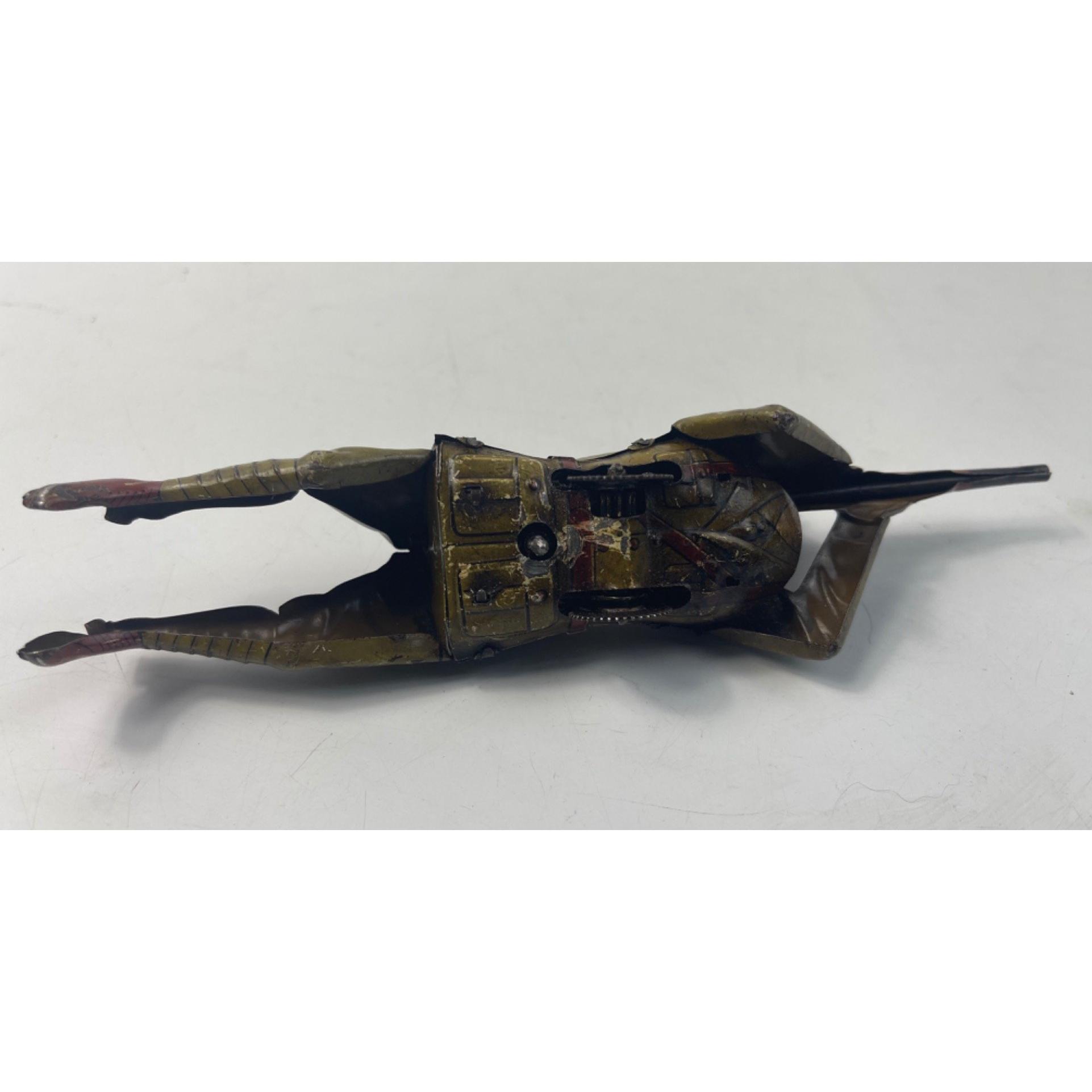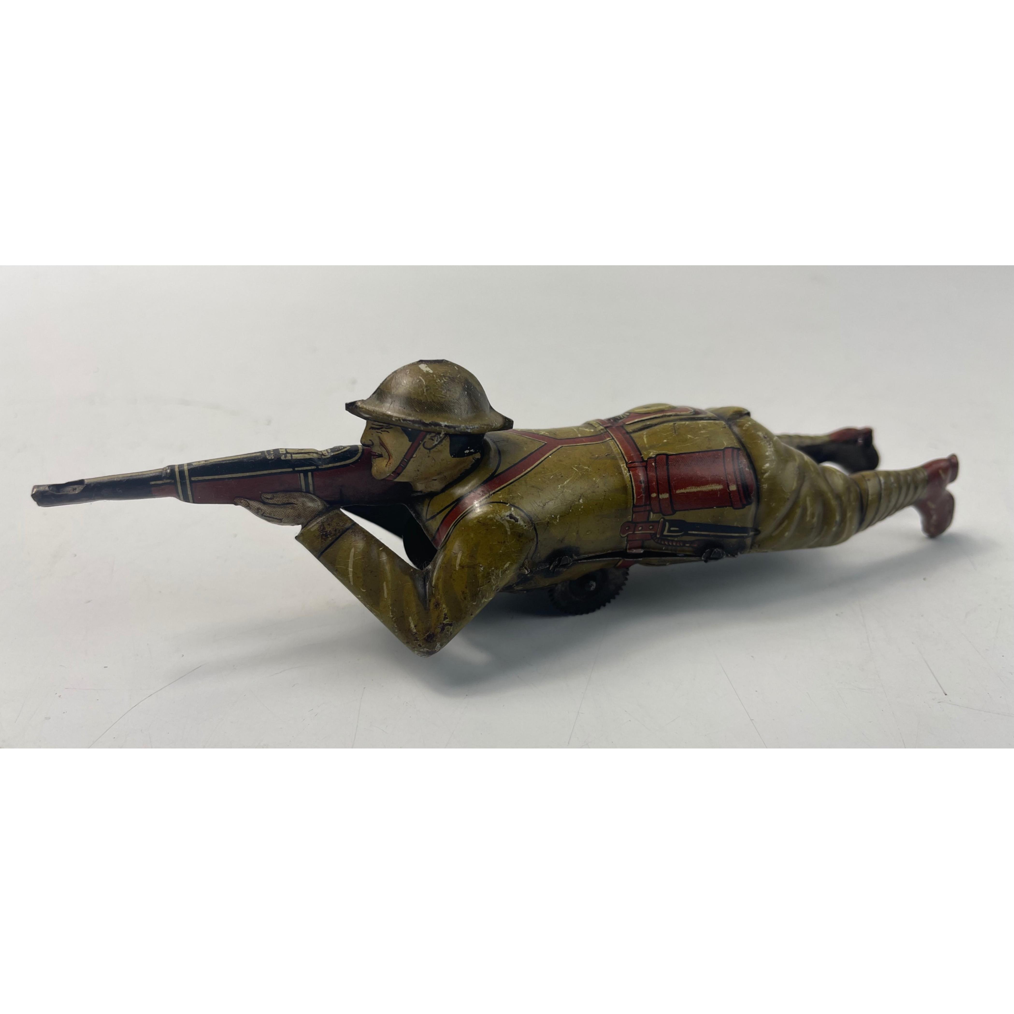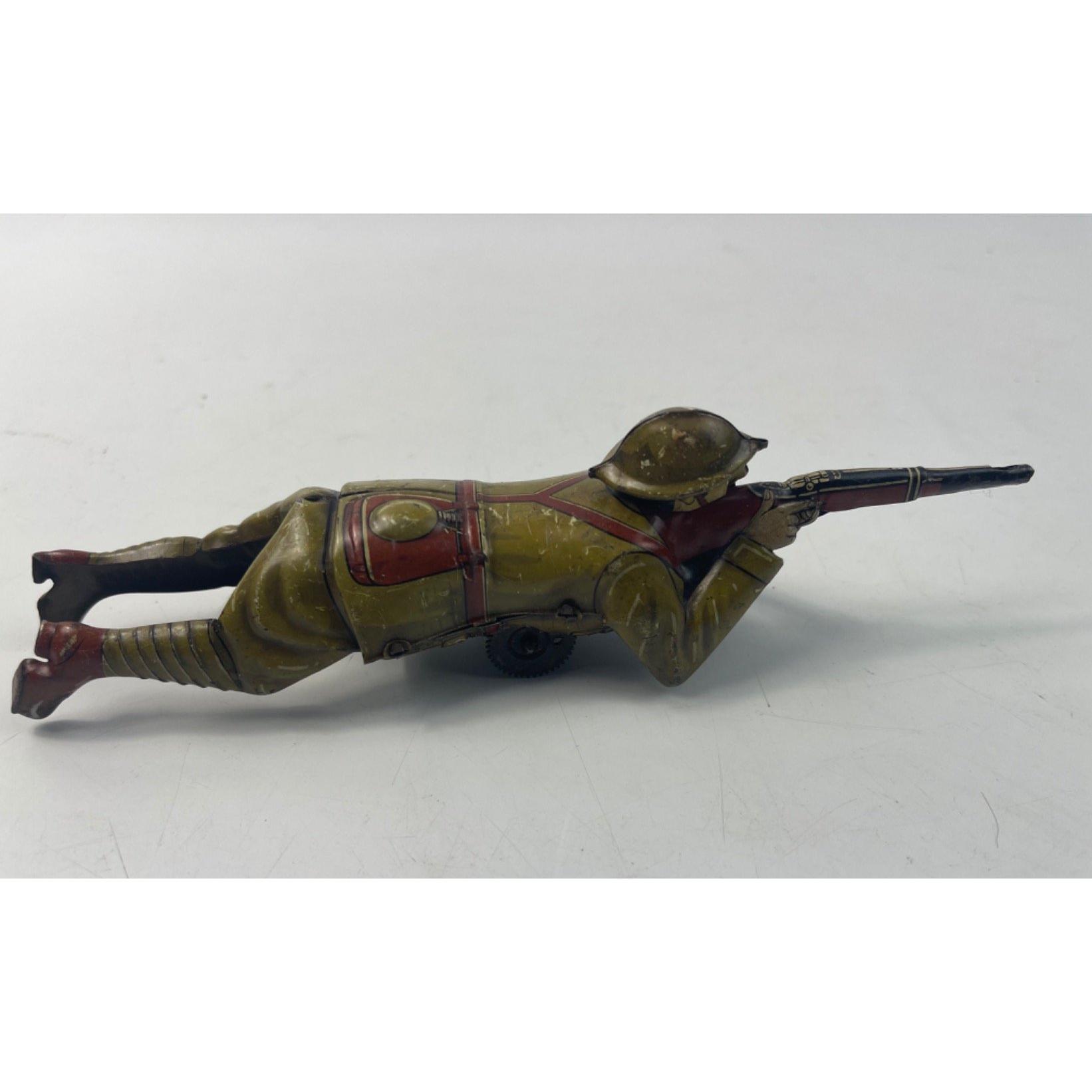 Vintage EINFALT (Germany) lithographed tin-plate clockwork figure of a WW1 soldier depicted lying on the ground firing a rifle. Dimensions length 19cm x 4cm at widest point - no original box or key, in working order - (tested with an ill-fitting key) and in good condition for its age