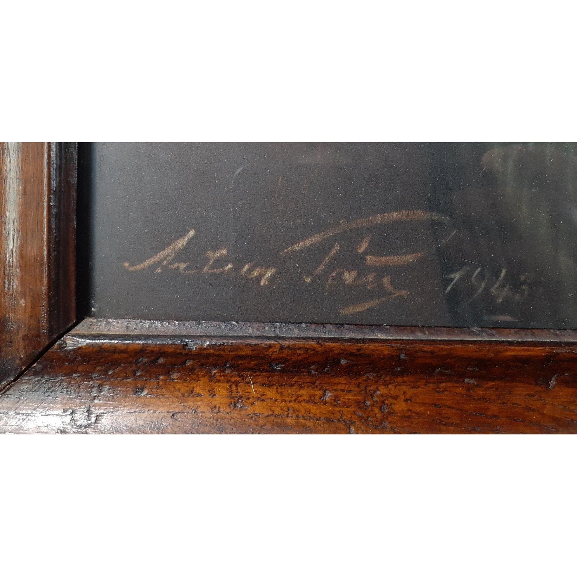An antique framed print of Sir WINSTON CHURCHILL in characteristic pose from a portrait by ARTHUR PAN. Frame 66x56cm approx. This style of portrait hung in government offices during his tenure as war-time leader.