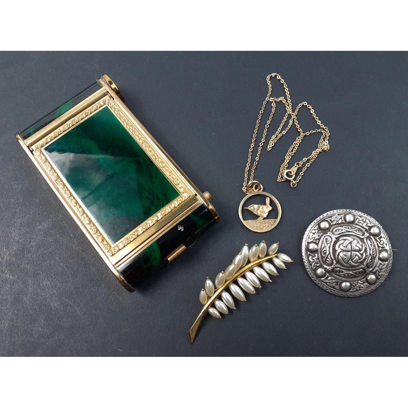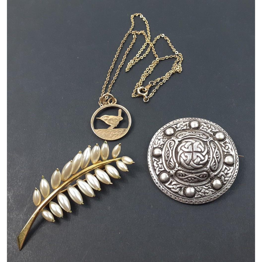 A small mixed lot to include a large EPNS brooch in the shape of a Scottish targe, a cut gilded farthing and a fern shaped brooch with white stones and a very attractive gilt compact