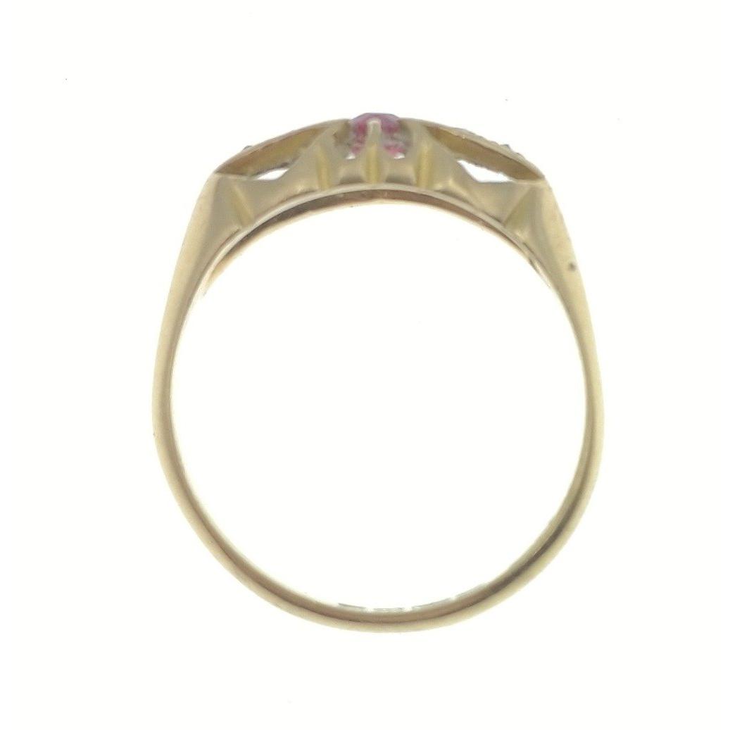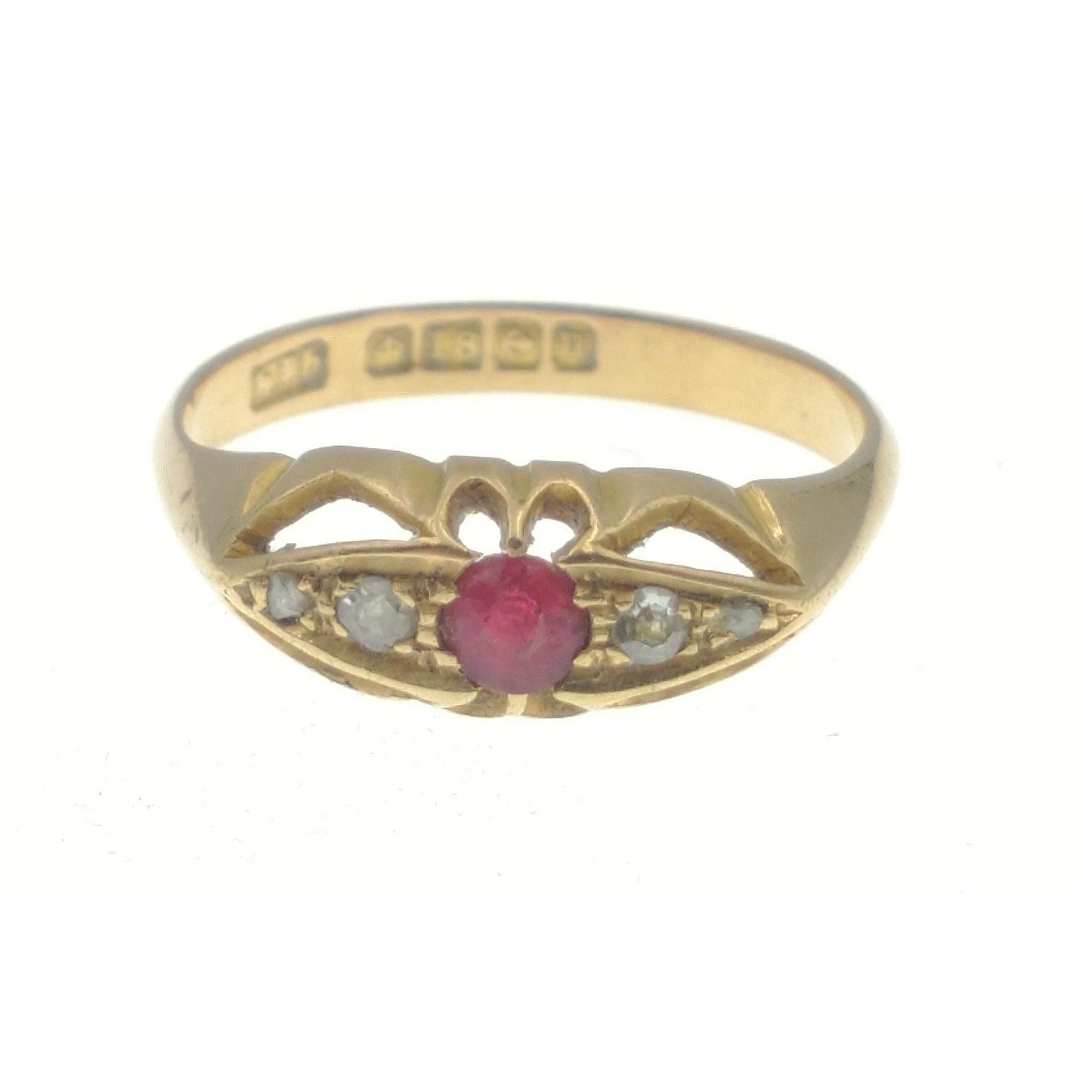 An 18ct gold ring with 4 small diamonds (tested), and a central red stone, fully hallmarked, gross weight 2.7g approx, size NApprox 1 pieces