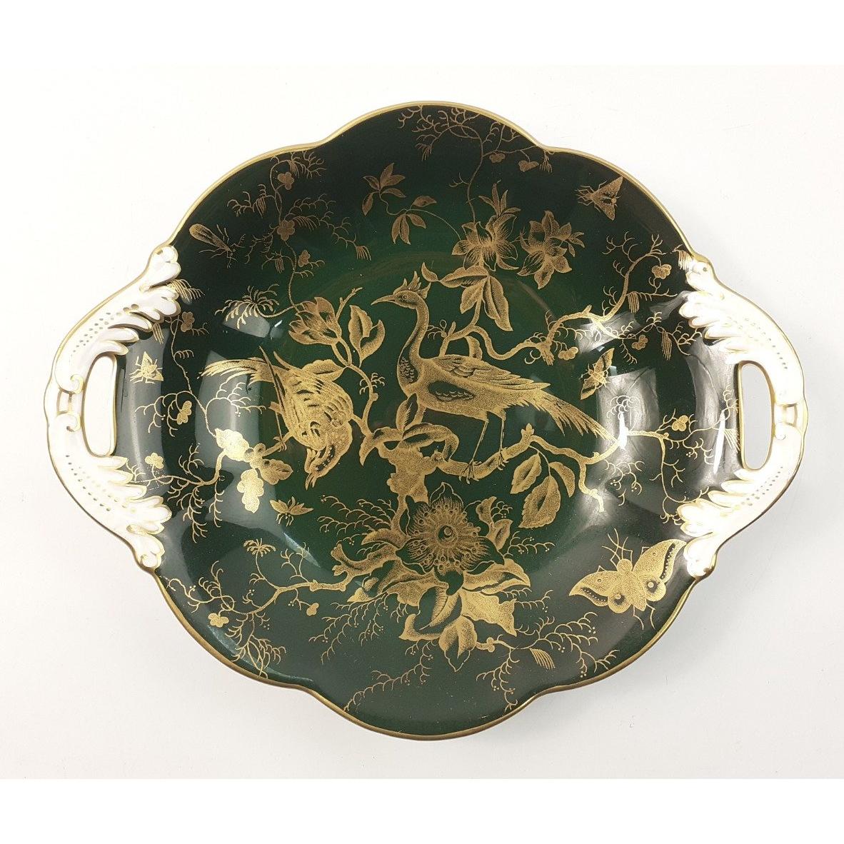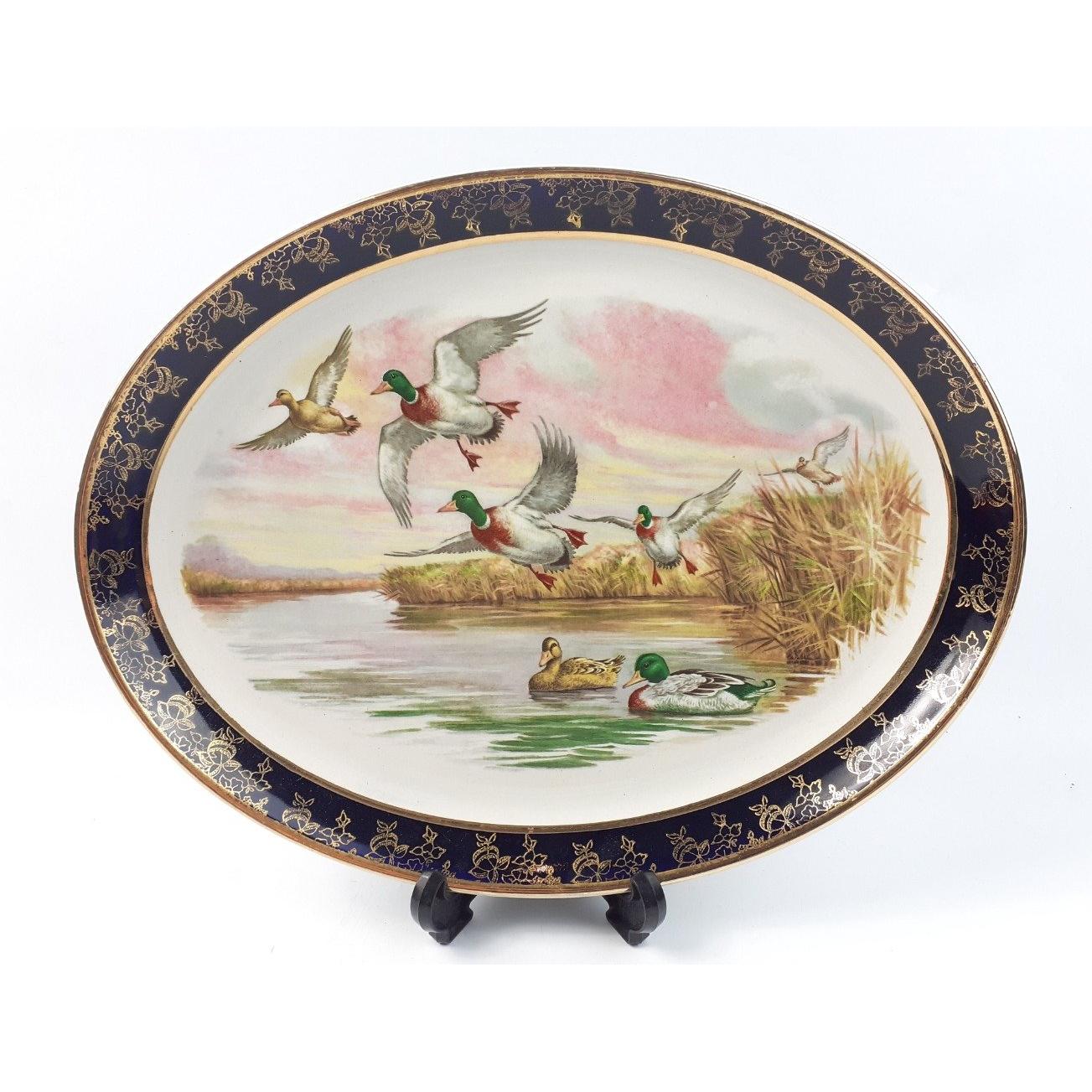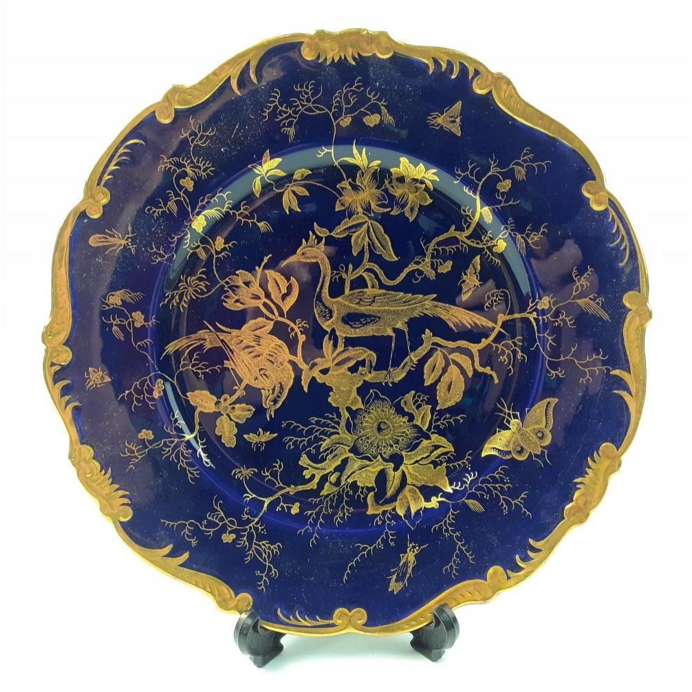 Two COALPORT dishes with exotic birds one green and gilt and the larger cobalt blue and gilt 27cm diameter and a WETHERBY HANLEY oval plate with wildfowl sceneApprox 3 pieces