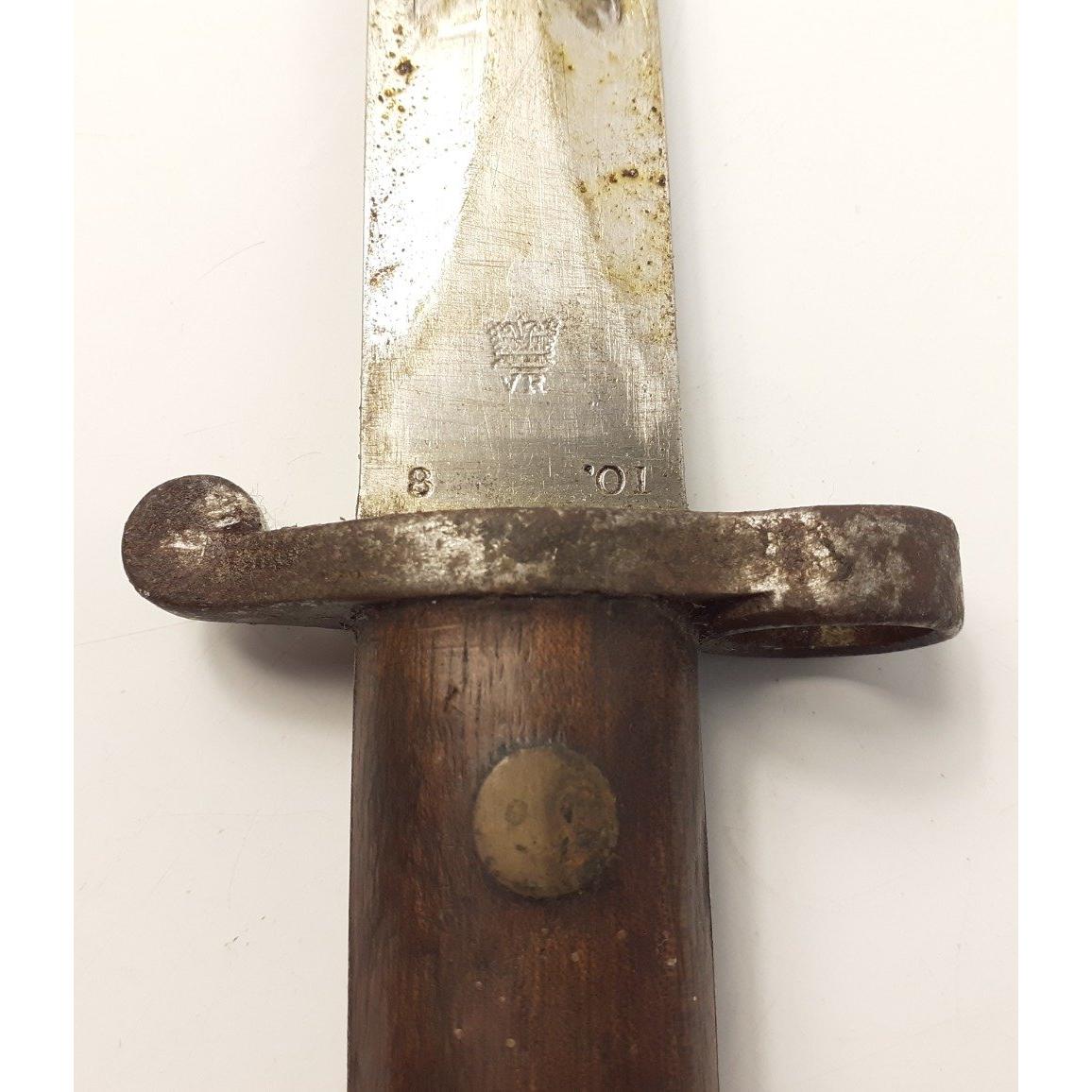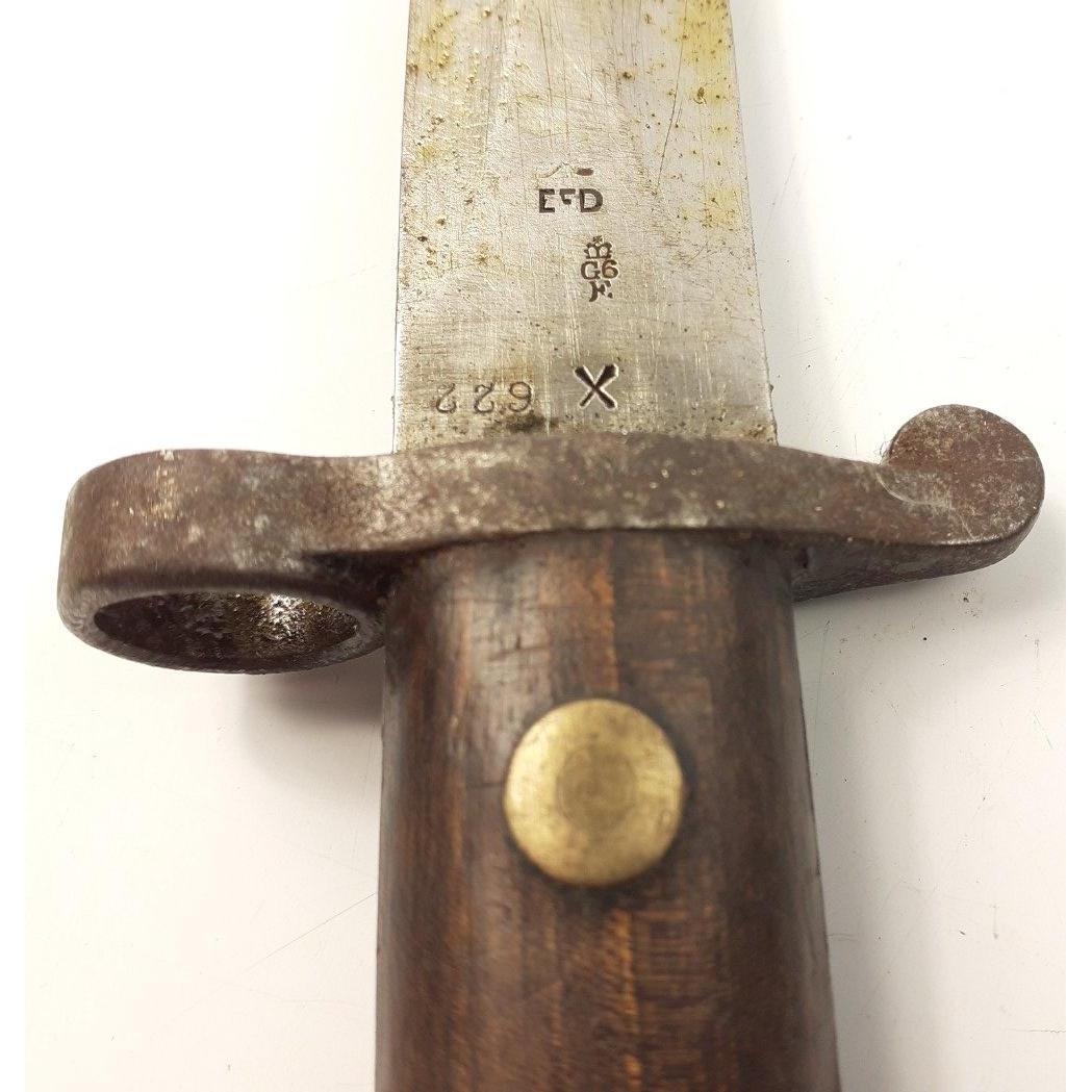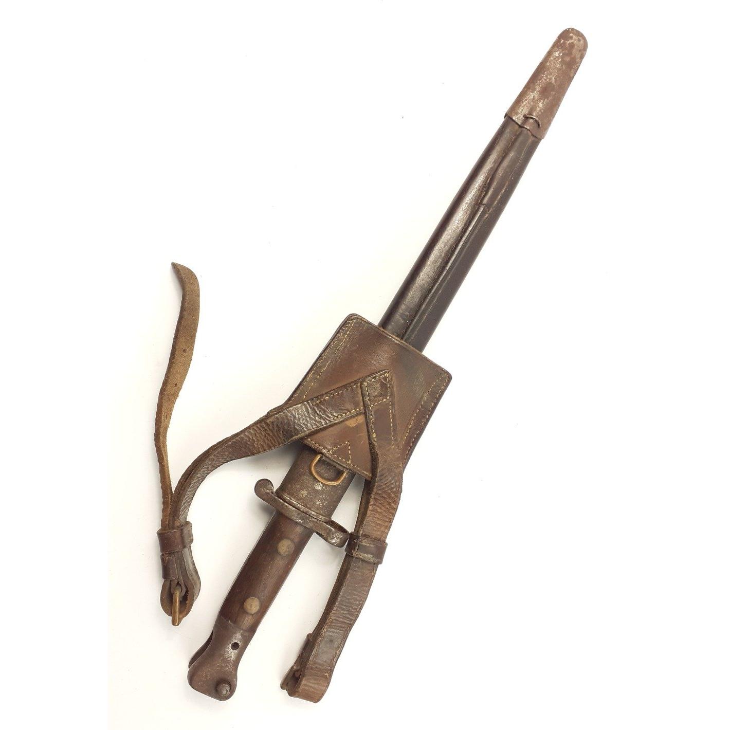 An excellent pre-WWI era British bayonet with original scabbard and frog, likely pattern 88 Mark I sword bayonet believed to be by Wilkinson marked 10 8 with VR cipher and later GR cipher, blade 30cm long. Heavily greased before storage and therefore in remarkably good condition. The leather on the frog is also excellent.