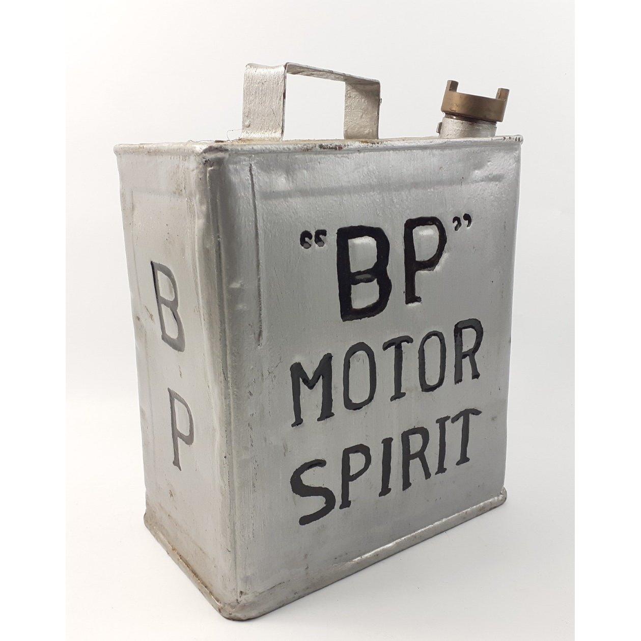 A "BP" Motor Spirit 2 gallon can overpainted in silver with black letteringApprox 1 pieces