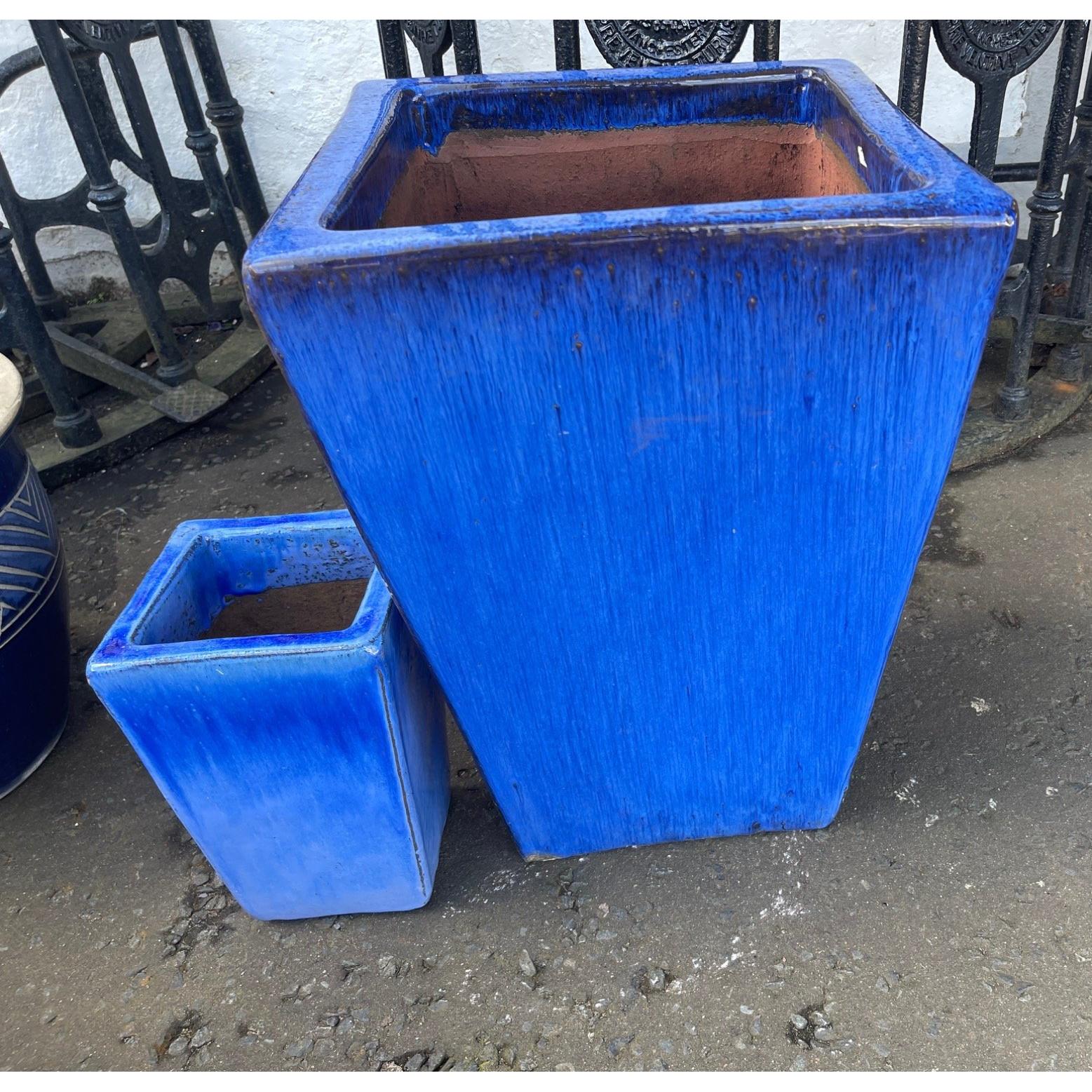 A HUGE FEATURE ceramic frost-free square tapered garden planter with a baby one to accompany it! - dimensions of the larger one 18" height x 1ft square top approx - starting bid £30Approx 2 pieces