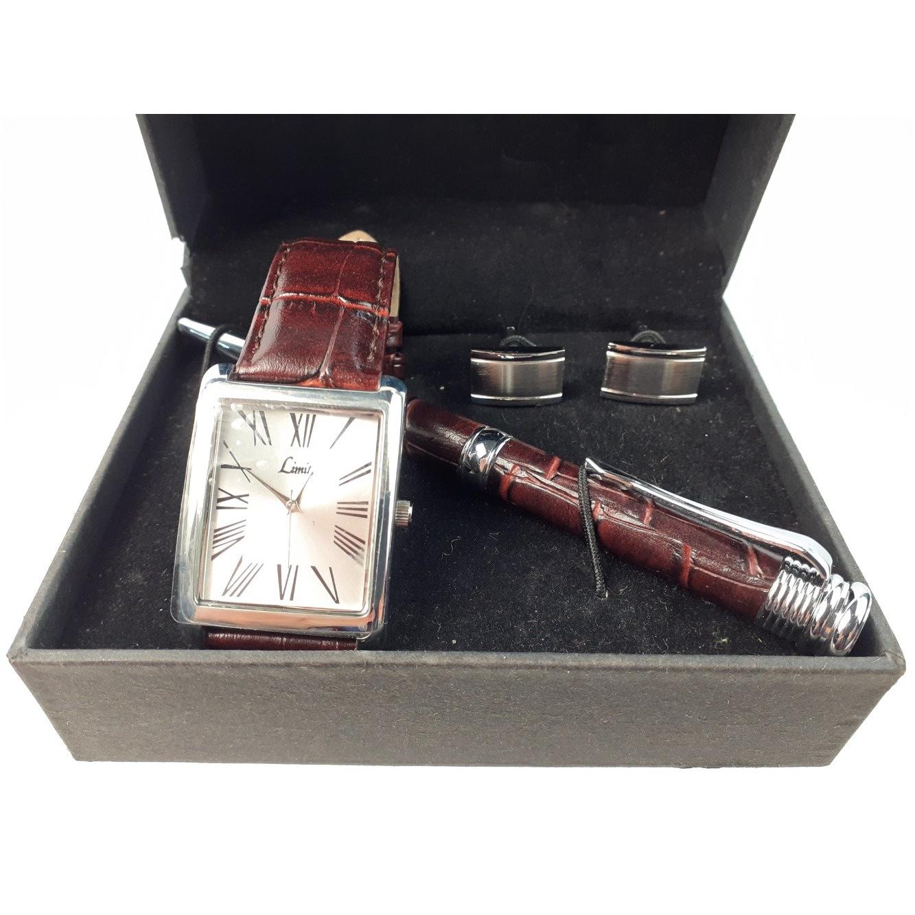 A LIMIT gift set of gent's watch, cufflinks and pen. Watch has a beautiful square face with Roman numerals and leather strap which matches the pen. Box has some damage.Approx 1 pieces