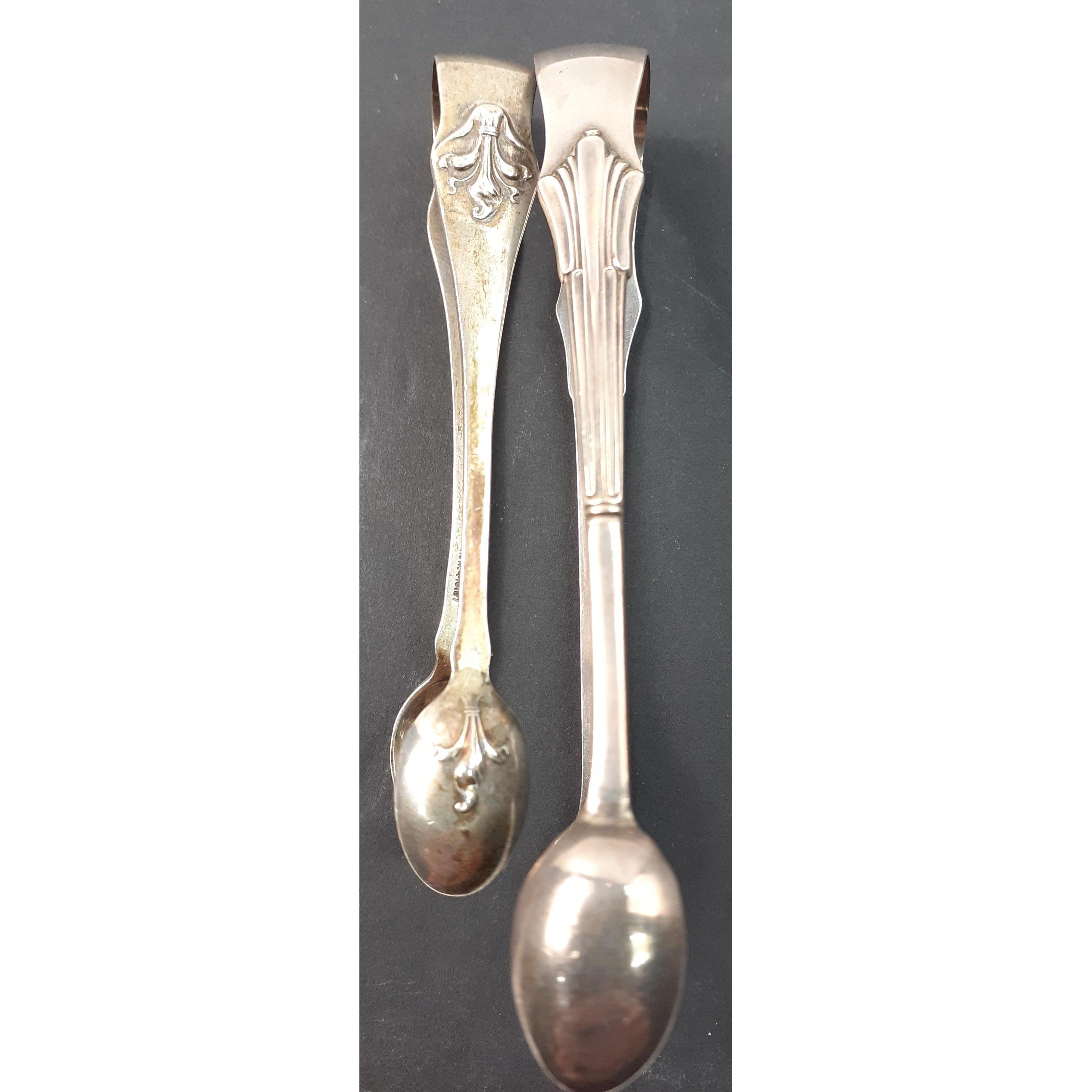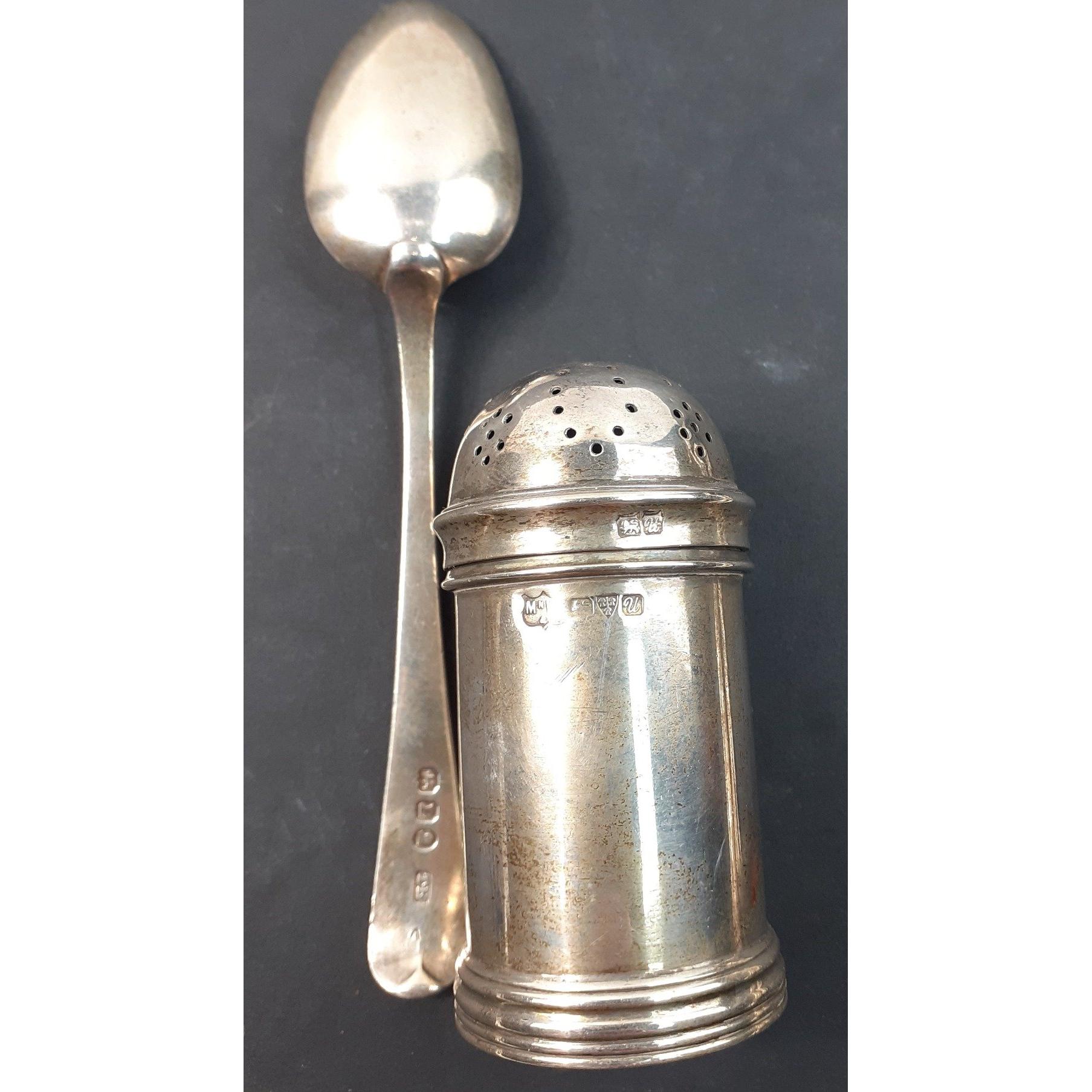 A small collection of silver items of interest to include a small MAPPIN & WEBB sifter (73.5g approx), a Victorian tea strainer (67g approx), 2 pairs of hallmarked nips (51g approx), a Georgian teaspoon (18g approx), 2 silver handled pieces of cutlery