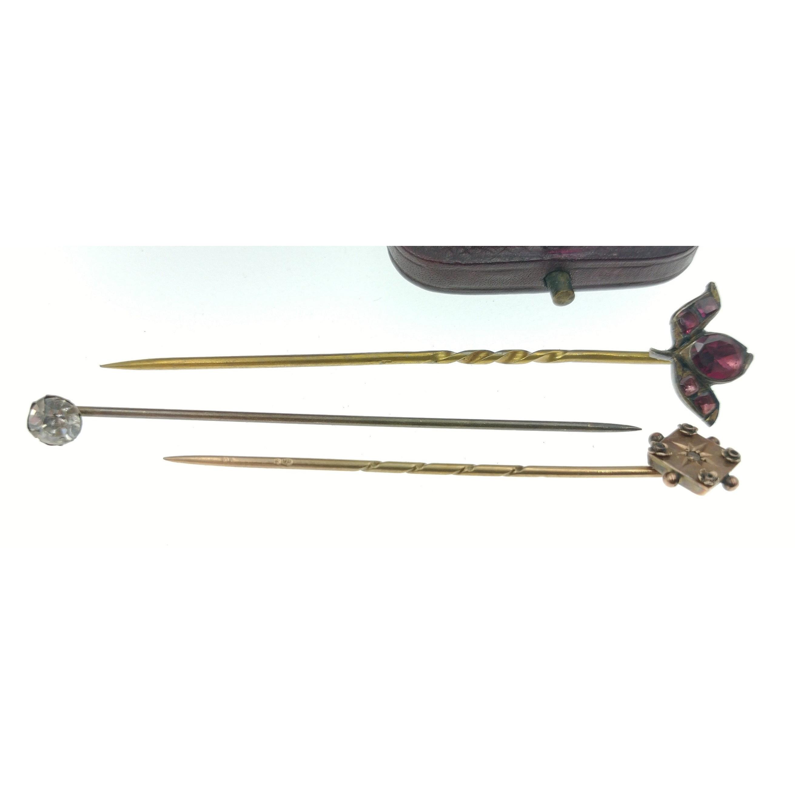 A super collection of gentlemen's tiepins in an antique case, one marked 9ct to rear (weight 1g approx), the others unmarked Approx 3 pieces