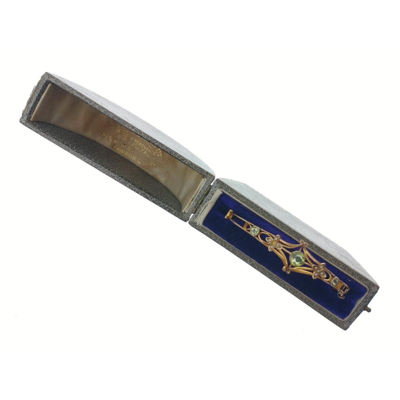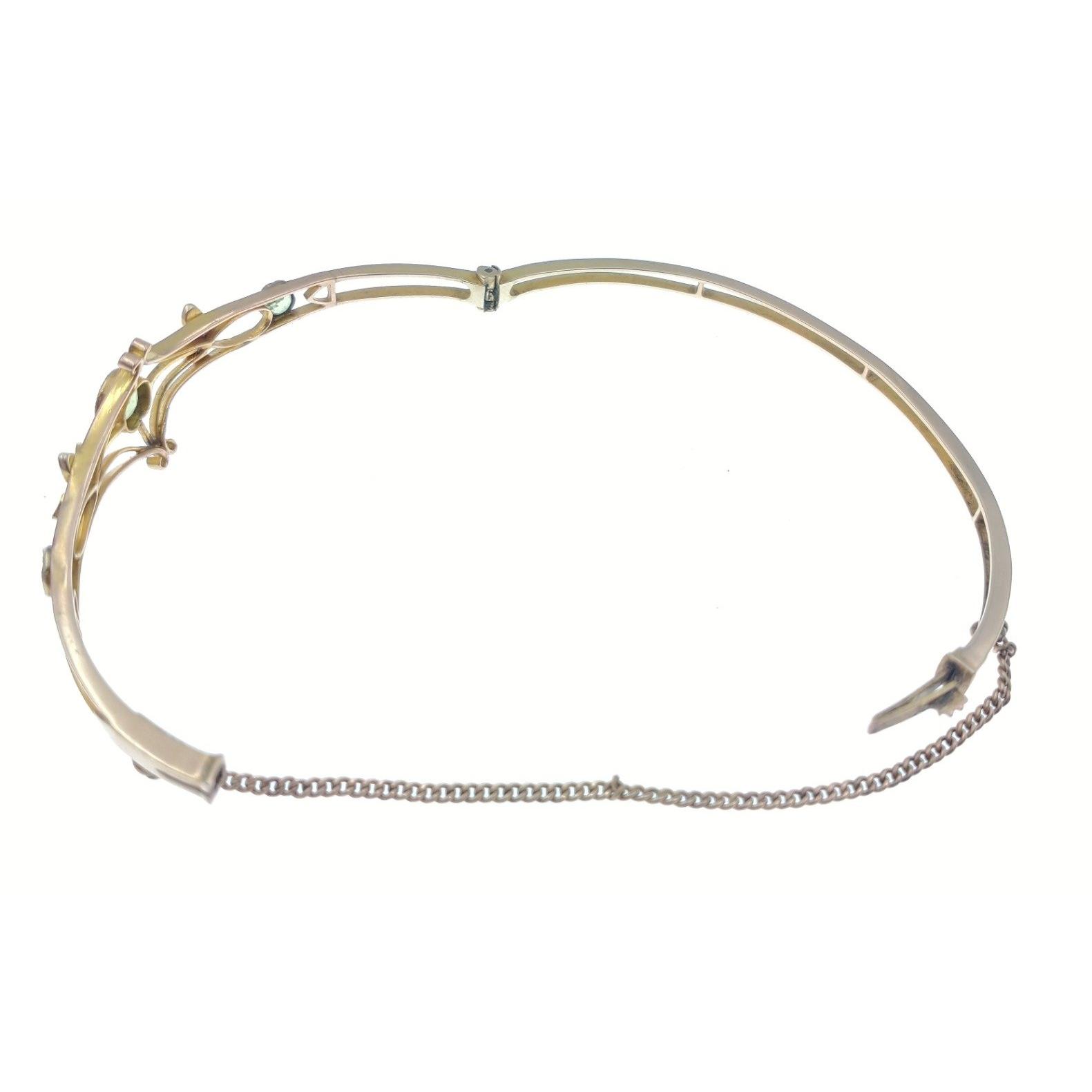 A delicate and unmarked yellow metal snap-shut bangle with safety chain set with peridot stone and seed pearls (1 missing) gross weight 6.4g approx, diameter 6cm approx. Comes with original attractive horseshoe-shaped box