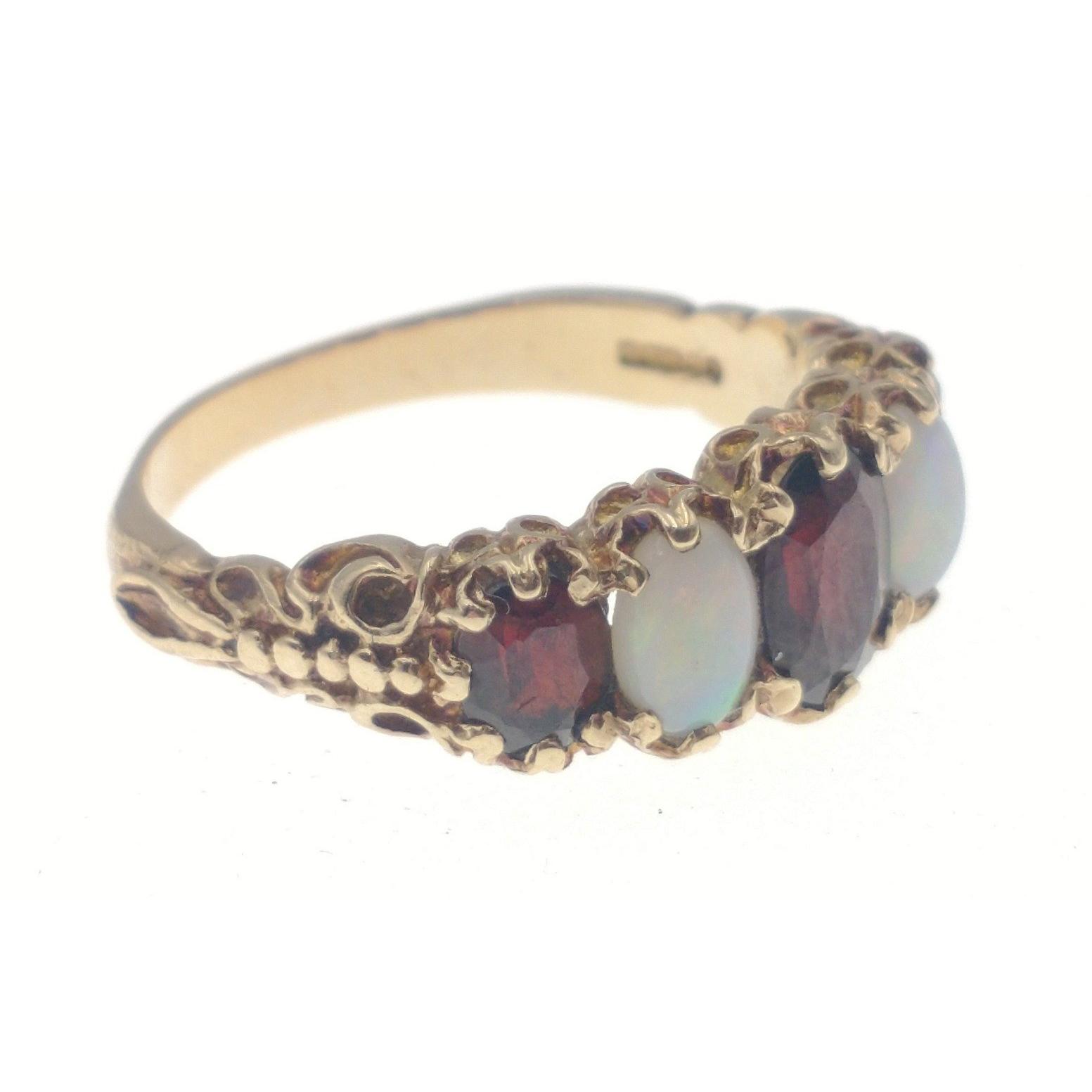 A 375 fully hallmarked opal and garnet ring, largest centre stone measures 6mm approx, size O, gross weight 3.9g approxApprox 1 pieces