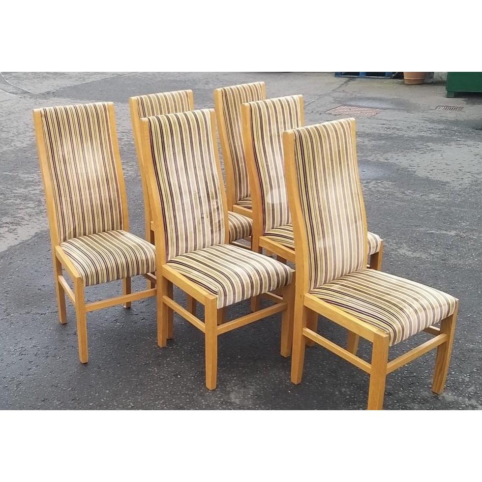 A set of six quality light oak dining chairs - with striped fabricApprox 6 pieces