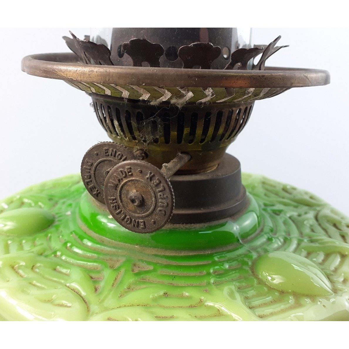 A large and impressive green glass oil lamp with a Palladian style column, stands 70cm tall including chimney. Wick winder stamped DUPLEX Approx 1 pieces