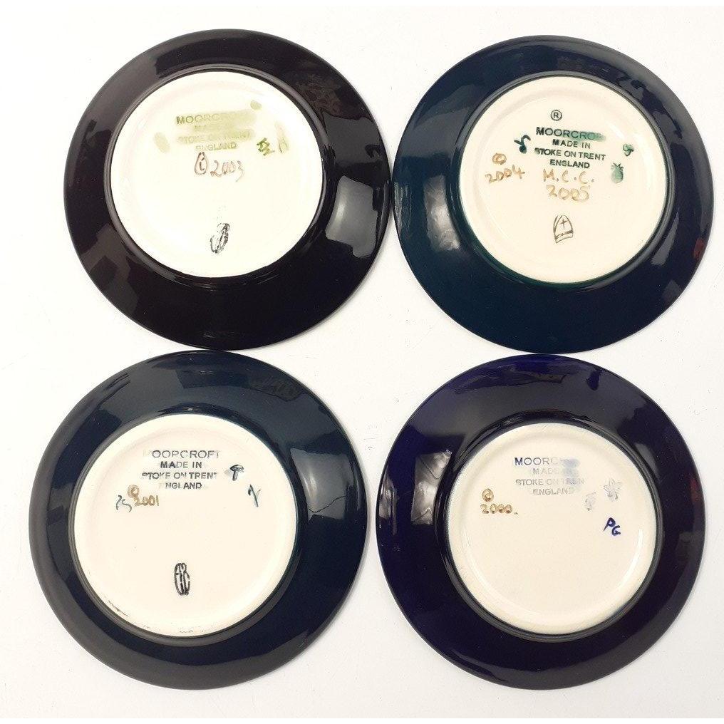 Four 12cm MOORCROFT signed and dated pin dishes, all signed and dated and also a 22cm collector's plate in box, with damageApprox 5 pieces