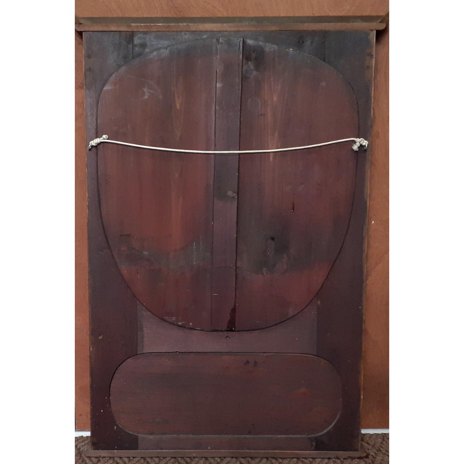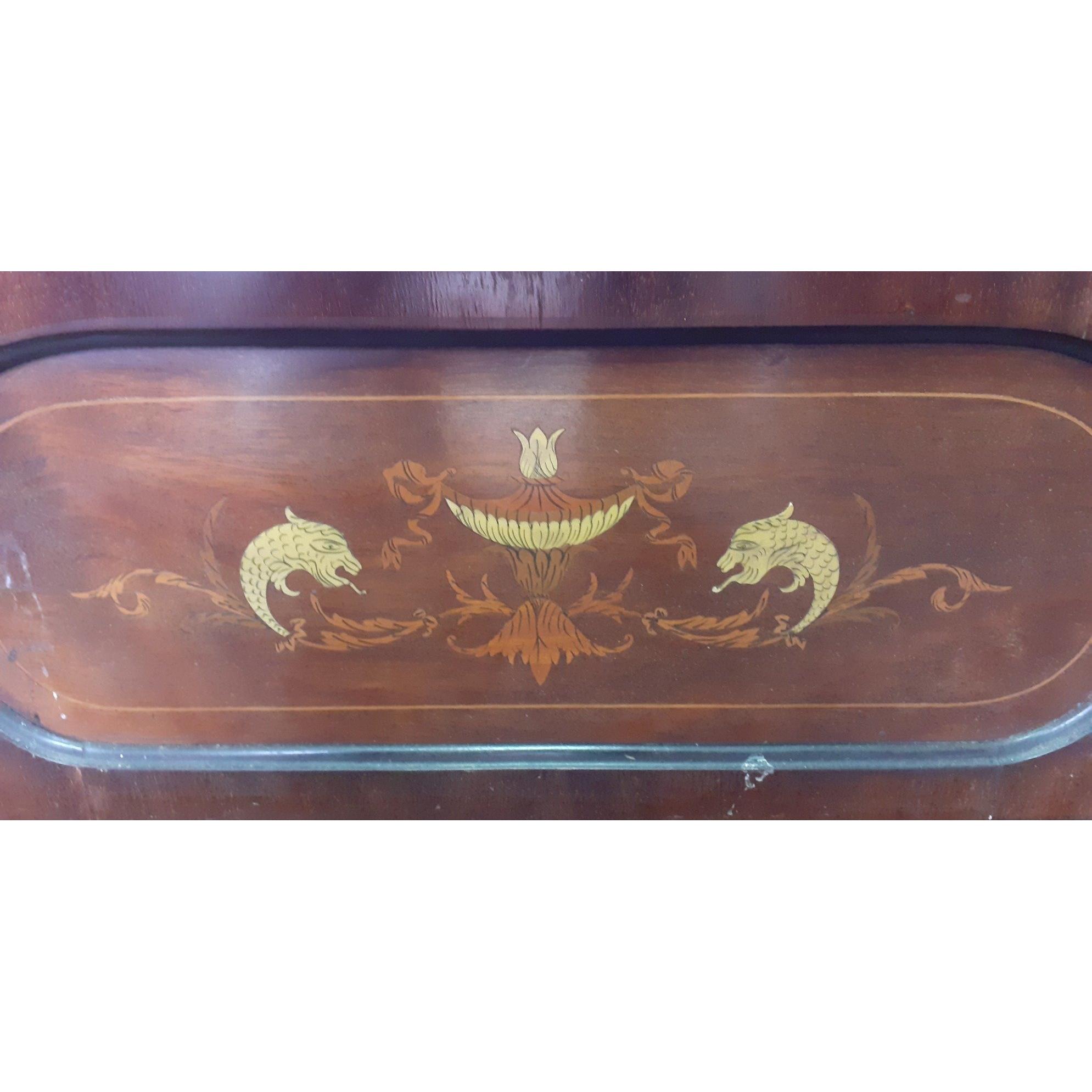 An antique bevelled shield-shaped glass wall mirror with dolphinesque motif inlay measures 106 x73cm. This item matches the bow-fronted sideboard. A beautiful piece.Approx 1 pieces