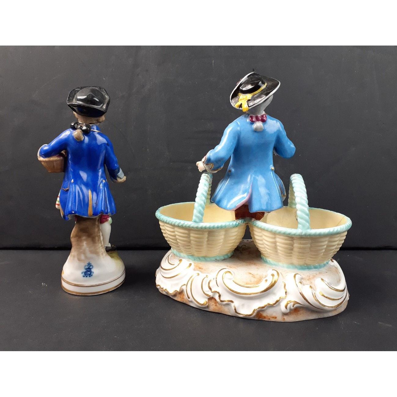 A MEISSEN porcelain figural double salt, modelled as a young boy wearing 18th century costume, and seated between 2 large baskets. Probably late 19th century. Damage to fingers on one hand, damage repaired and chip missing from one basket. Stands 16cm tall and also a VOLKSTEDT porcelain figurine of a boy with a flower basket, dates to approx 1915-1934.